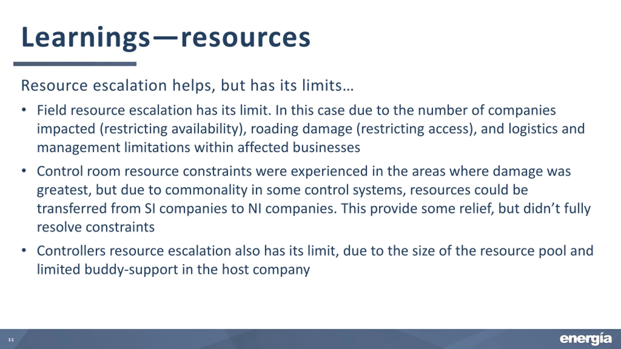 Learningsresources Resource escalation helps, but has its limits Field resource escalation has its limit. In this case due to the number of companies impacted (restricting availability), roading damage (restricting access), and logistics and management limitations within affected businesses Control room resource constraints were experienced in the areas where damage was greatest, but due to commonality in some control systems, resources could be transferred from SI companies to NI companies. This provide some relief, but didn t fully resolve constraints Controllers resource escalation also has its limit, due to the size of the resource pool and limited buddy-support in the host company 11