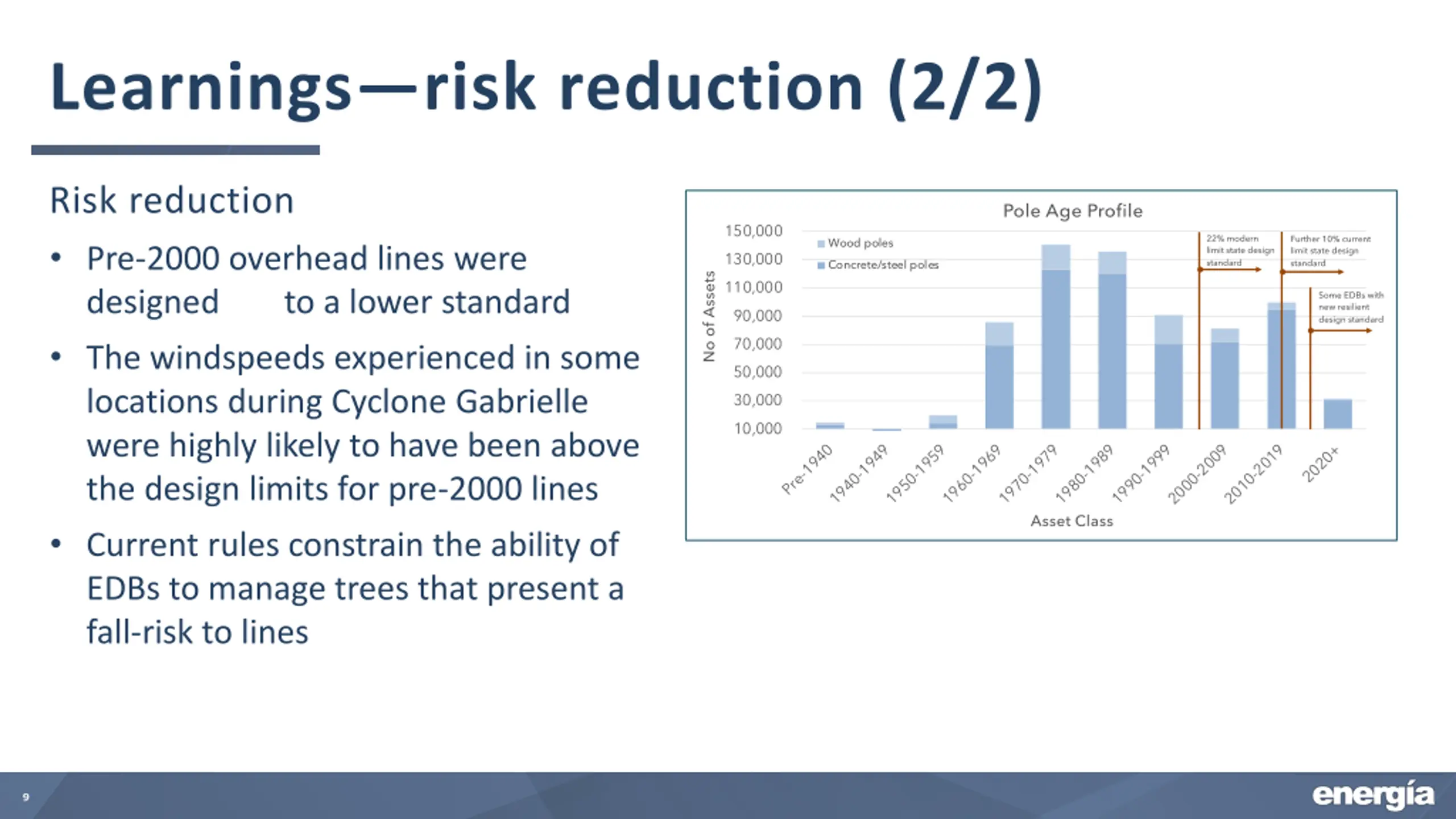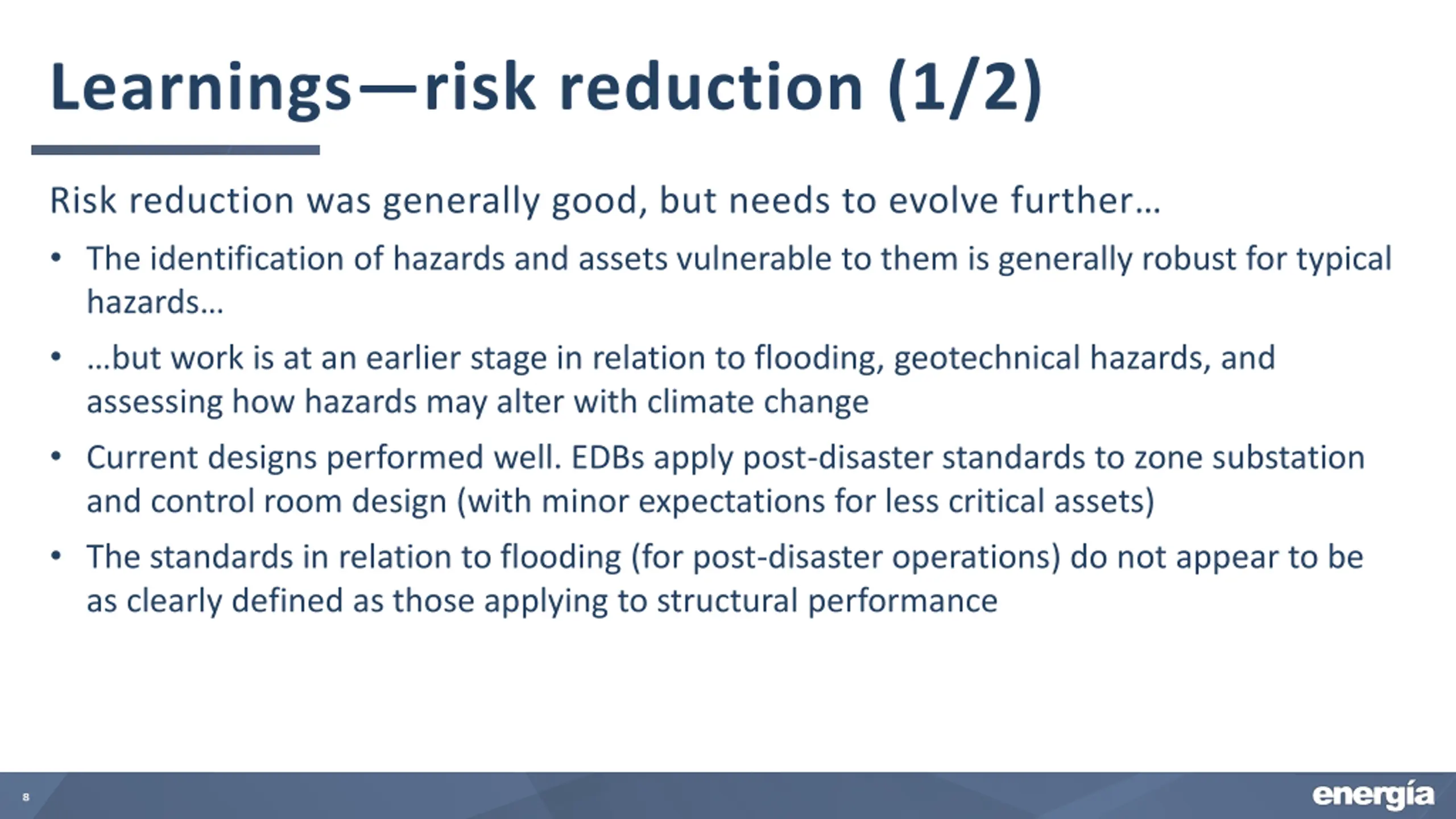 Learningsrisk reduction (1/2) Risk reduction was generally good, but needs to evolve further The identification of hazards and assets vulnerable to them is generally robust for typical hazards but work is at an earlier stage in relation to flooding, geotechnical hazards, and assessing how hazards may alter with climate change Current designs performed well. EDBs apply post-disaster standards to zone substation and control room design (with minor expectations for less critical assets) The standards in relation to flooding (for post-disaster operations) do not appear to be as clearly defined as those applying to structural performance 8