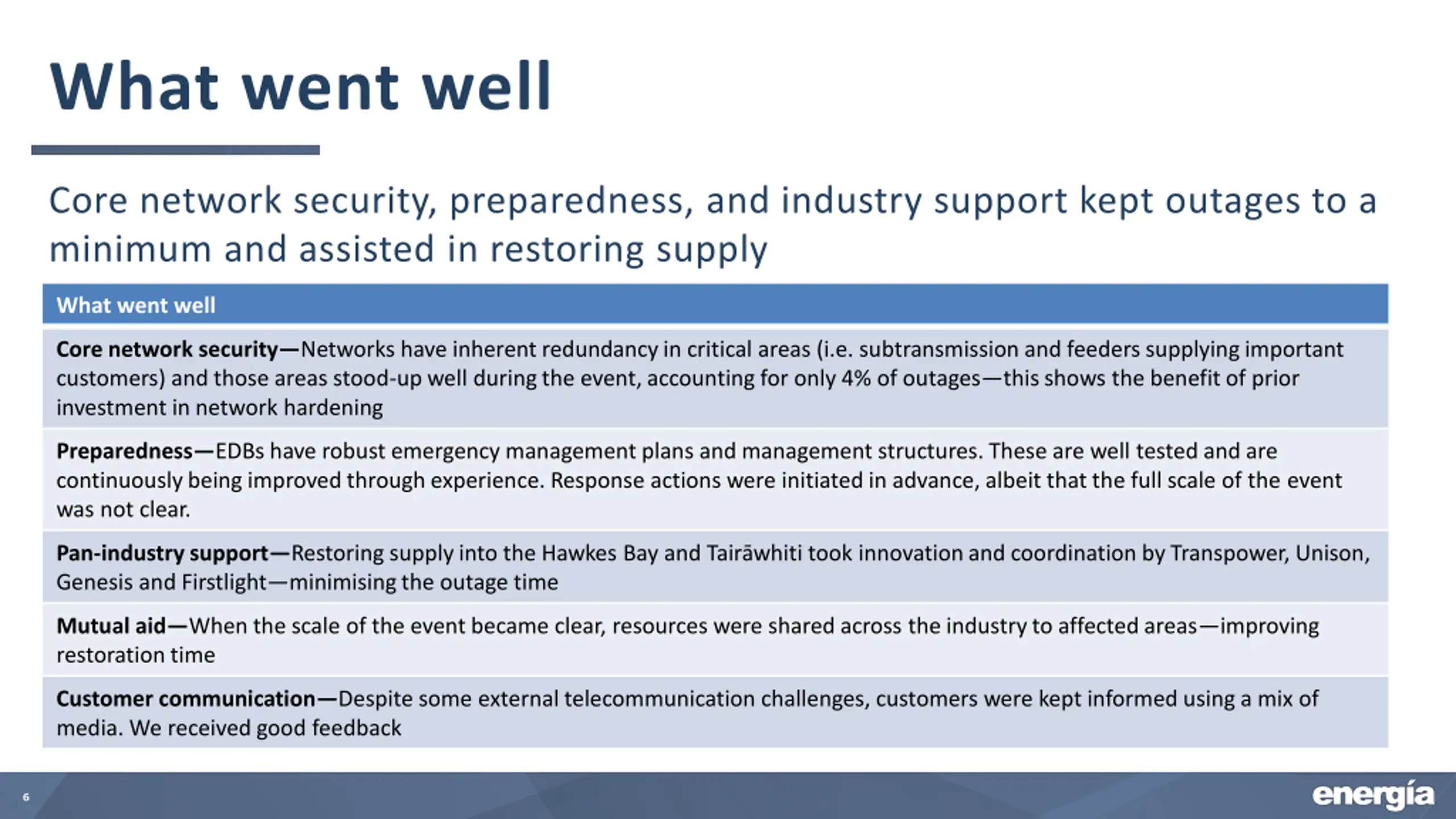 What went well Core network security, preparedness, and industry support kept outages to a minimum and assisted in restoring supply What went well Core network security Networks have inherent redundancy in critical areas (i.e. subtransmission and feeders supplying important customers) and those areas stood-up well during the event, accounting for only 4% of outages this shows the benefit of prior investment in network hardening Preparedness EDBs have robust emergency management plans and management structures. These are well tested and are continuously being improved through experience. Response actions were initiated in advance, albeit that the full scale of the event was not clear. Pan-industry support Restoring supply into the Hawkes Bay and Tair whiti took innovation and coordination by Transpower, Unison, Genesis and Firstlight minimising the outage time Mutual aid When the scale of the event became clear, resources were shared across the industry to affected areas improving restoration time Customer communication Despite some external telecommunication challenges, customers were kept informed using a mix of media. We received good feedback 6