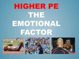 Emotional Factor Task Discuss each aspect of the emotional factor in your group. Come up with one example of when this aspect may occur during a game of Basketball. One person from your group will feedback your group s answers to the class. Here are some examples, you may not use these!! Happiness You scored an absolute stoater of a jump shot to win the match! Fear A giant was man marking you and was overly aggressive in defence. Surprise You won a rebound against the giant. Anger The referee did not see you being fouled by the giant. Trust A taller more physical player decided to mark the giant on your defence.