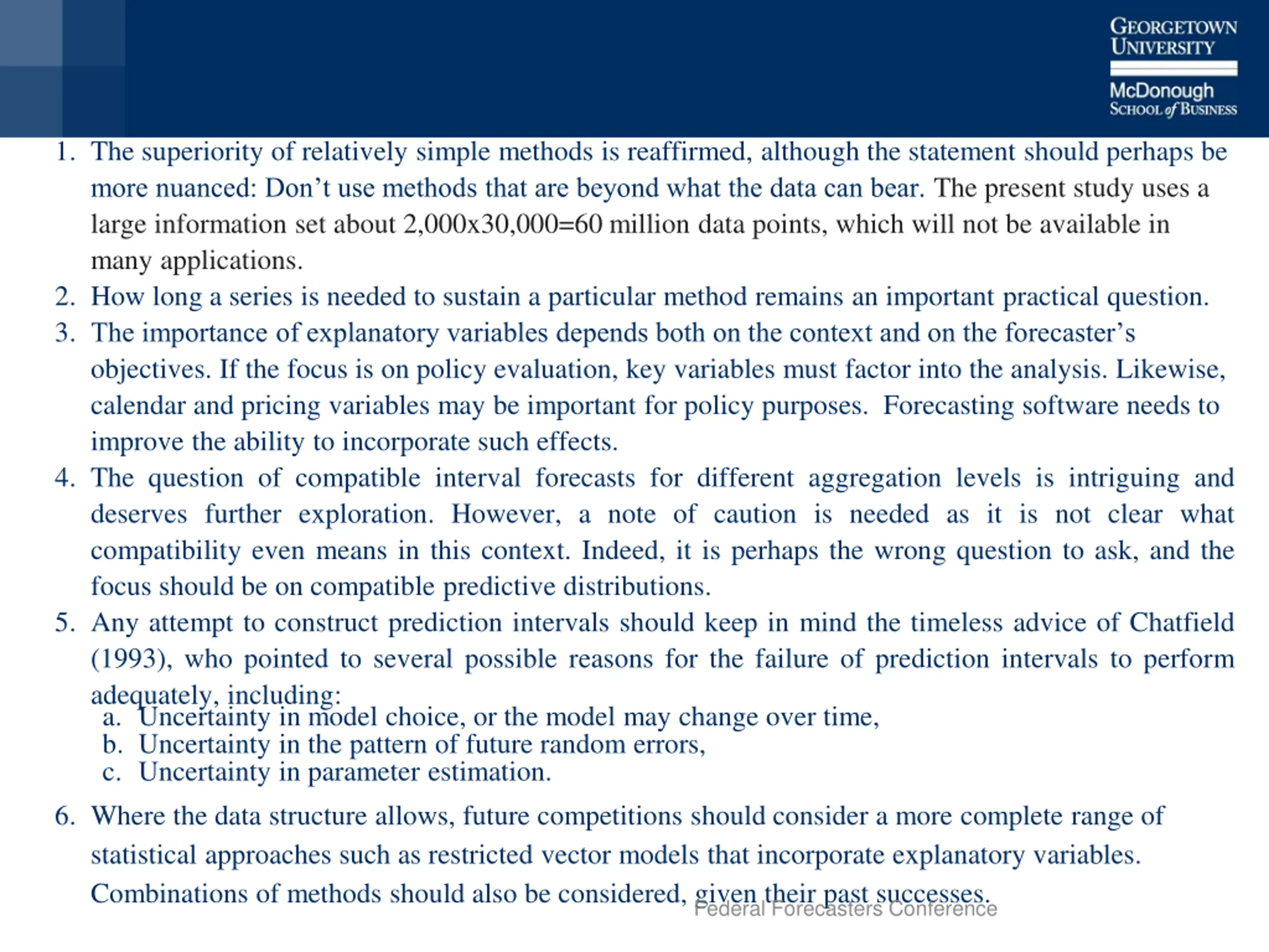 1. The superiority of relatively simple methods is reaffirmed, although the statement should perhaps be What can statistical modelers learn going forward? more nuanced: Don t use methods that are beyond what the data can bear. The present study uses a large information set about 2,000x30,000=60 million data points, which will not be available in many applications. 2. How long a series is needed to sustain a particular method remains an important practical question. 3. The importance of explanatory variables depends both on the context and on the forecaster s objectives. If the focus is on policy evaluation, key variables must factor into the analysis. Likewise, calendar and pricing variables may be important for policy purposes. Forecasting software needs to improve the ability to incorporate such effects. 4. The question of compatible interval forecasts for different aggregation levels is intriguing and deserves further exploration. However, a note of caution is needed as it is not clear what compatibility even means in this context. Indeed, it is perhaps the wrong question to ask, and the focus should be on compatible predictive distributions. 5. Any attempt to construct prediction intervals should keep in mind the timeless advice of Chatfield (1993), who pointed to several possible reasons for the failure of prediction intervals to perform adequately, including: a. Uncertainty in model choice, or the model may change over time, b. Uncertainty in the pattern of future random errors, c. Uncertainty in parameter estimation. 6. Where the data structure allows, future competitions should consider a more complete range of statistical approaches such as restricted vector models that incorporate explanatory variables. Combinations of methods should also be considered, given their past successes. Federal Forecasters Conference 10/ 3/2