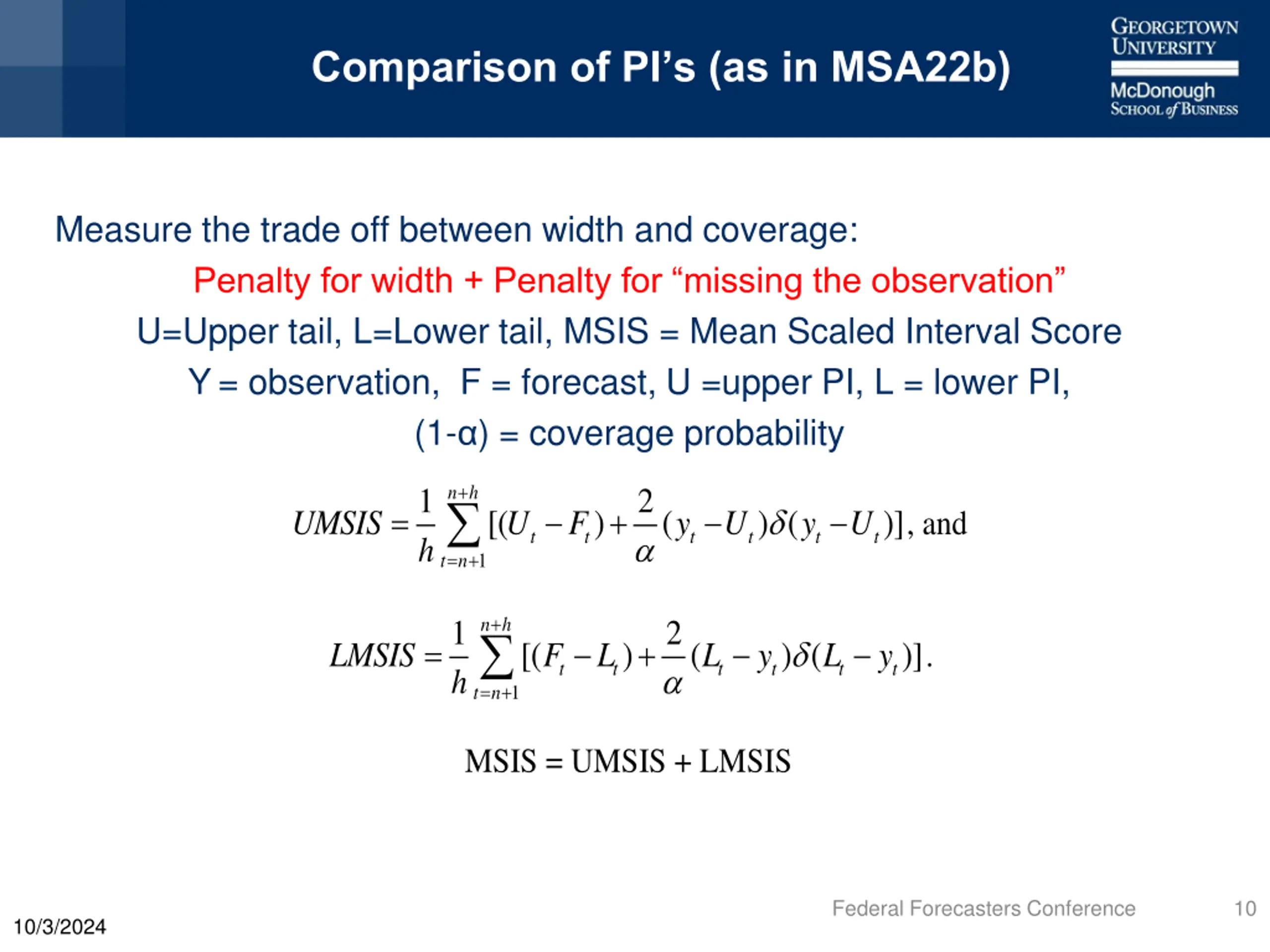Comparison of PIs (as in MSA22b) Measure the trade off between width and coverage: Penalty for width + Penalty for missing the observation U=Upper tail, L=Lower tail, MSIS = Mean Scaled Interval Score Y= observation, F = forecast, U =upper PI, L = lower PI, (1- ) = coverage probability n h + 1 h 2 = + ) ( [( ) ( )] UMSIS U F y U y U , and t t t t t t t n = + 1 n h + 1 h 2 = + ) ( [( ) ( )] LMSIS F L L y L y . t t t t t t t n = + 1 MSIS = UMSIS + LMSIS Federal Forecasters Conference 10 10/3/2024