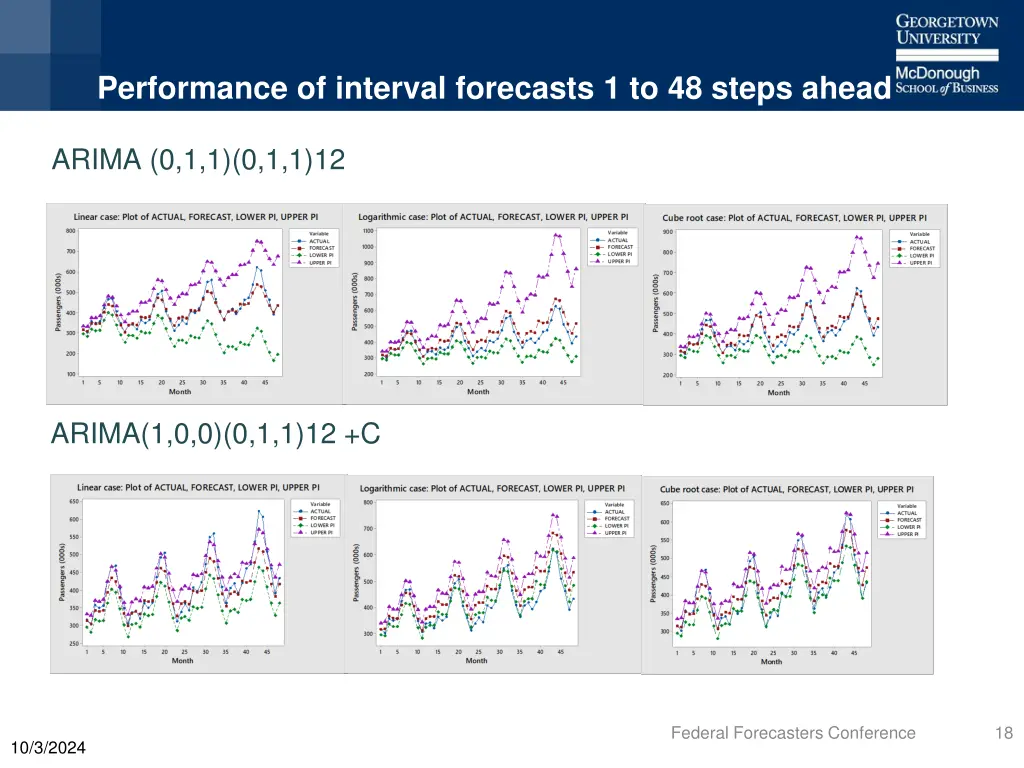 Performance of interval forecasts 1 to 48 steps ahead ARIMA (0,1,1)(0,1,1)12 ARIMA(1,0,0)(0,1,1)12 +C Federal Forecasters Conference 18 10/3/2024