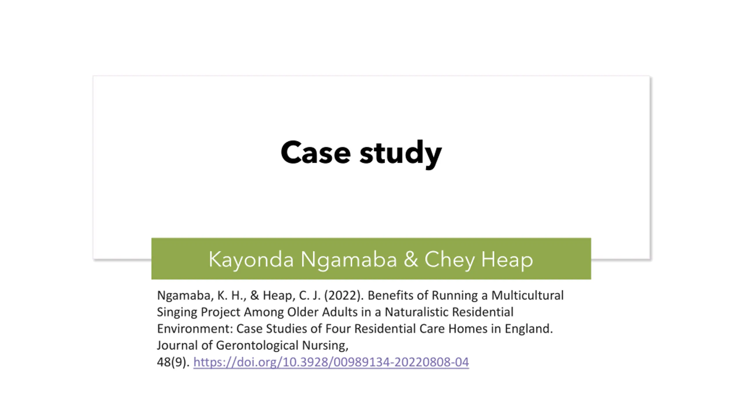 Case study Kayonda Ngamaba & Chey Heap Ngamaba, K. H., & Heap, C. J. (2022). Benefits of Running a Multicultural Singing Project Among Older Adults in a Naturalistic Residential Environment: Case Studies of Four Residential Care Homes in England. Journal of Gerontological Nursing, 48(9). https://doi.org/10.3928/00989134-20220808-04
