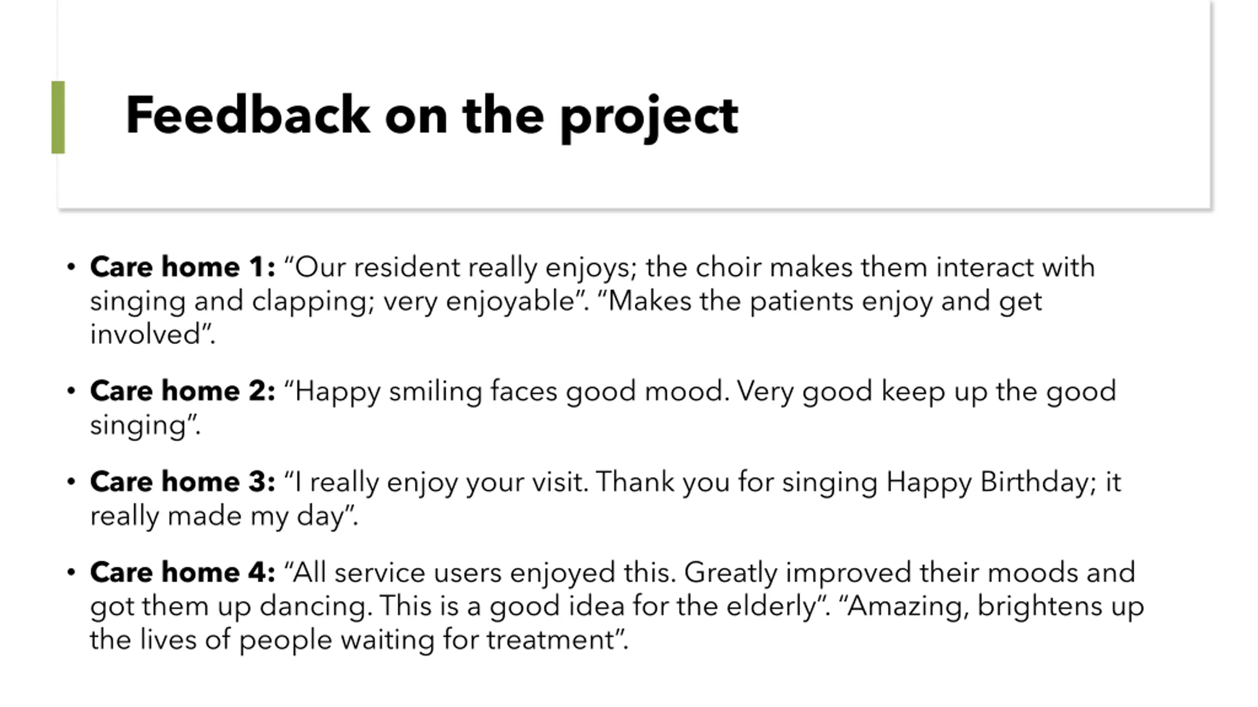 Feedback on the project Care home 1: Our resident really enjoys; the choir makes them interact with singing and clapping; very enjoyable . Makes the patients enjoy and get involved . Care home 2: Happy smiling faces good mood. Very good keep up the good singing . Care home 3: I really enjoy your visit. Thank you for singing Happy Birthday; it really made my day . Care home 4: All service users enjoyed this. Greatly improved their moods and got them up dancing. This is a good idea for the elderly . Amazing, brightens up the lives of people waiting for treatment .