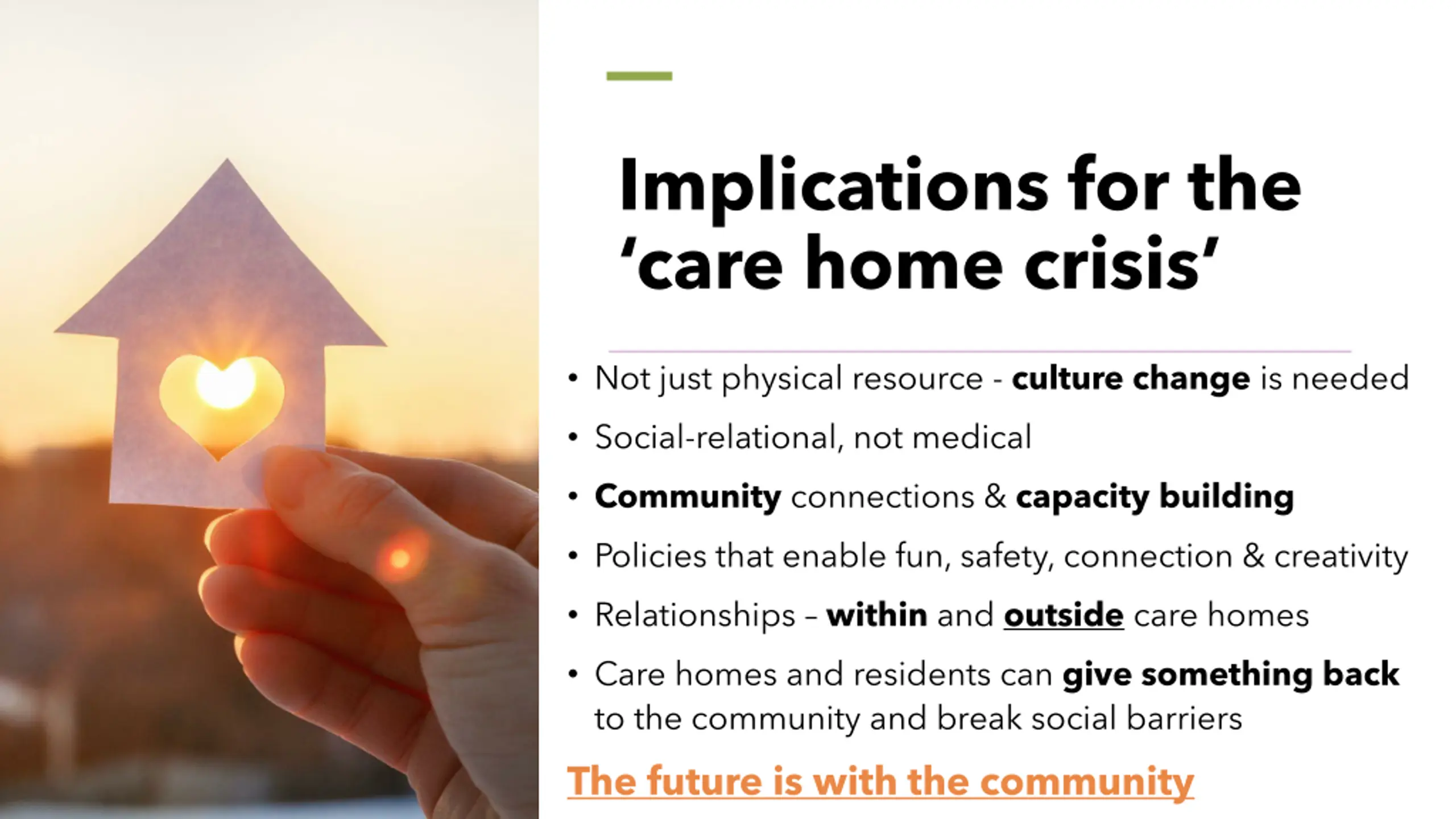 Implications for the care home crisis Not just physical resource - culture change is needed Social-relational, not medical Community connections & capacity building Policies that enable fun, safety, connection & creativity Relationships within and outside care homes Care homes and residents can give something back to the community and break social barriers The future is with the community