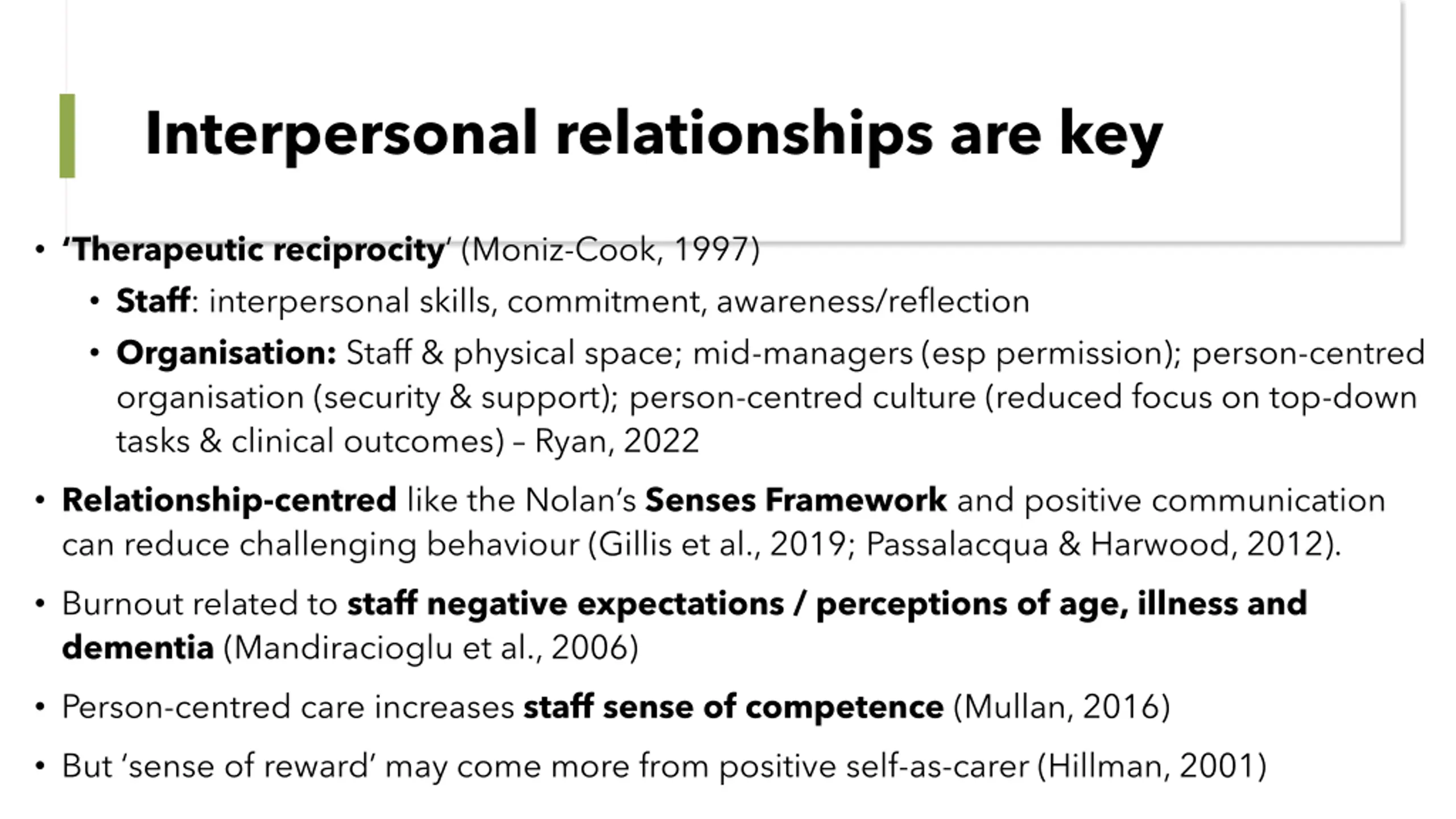 Interpersonal relationships are key Therapeutic reciprocity (Moniz-Cook, 1997) Staff: interpersonal skills, commitment, awareness/reflection Organisation: Staff & physical space; mid-managers (esp permission); person-centred organisation (security & support); person-centred culture (reduced focus on top-down tasks & clinical outcomes) Ryan, 2022 Relationship-centred like the Nolan s Senses Framework and positive communication can reduce challenging behaviour (Gillis et al., 2019; Passalacqua & Harwood, 2012). Burnout related to staff negative expectations / perceptions of age, illness and dementia (Mandiracioglu et al., 2006) Person-centred care increases staff sense of competence (Mullan, 2016) But sense of reward may come more from positive self-as-carer (Hillman, 2001)