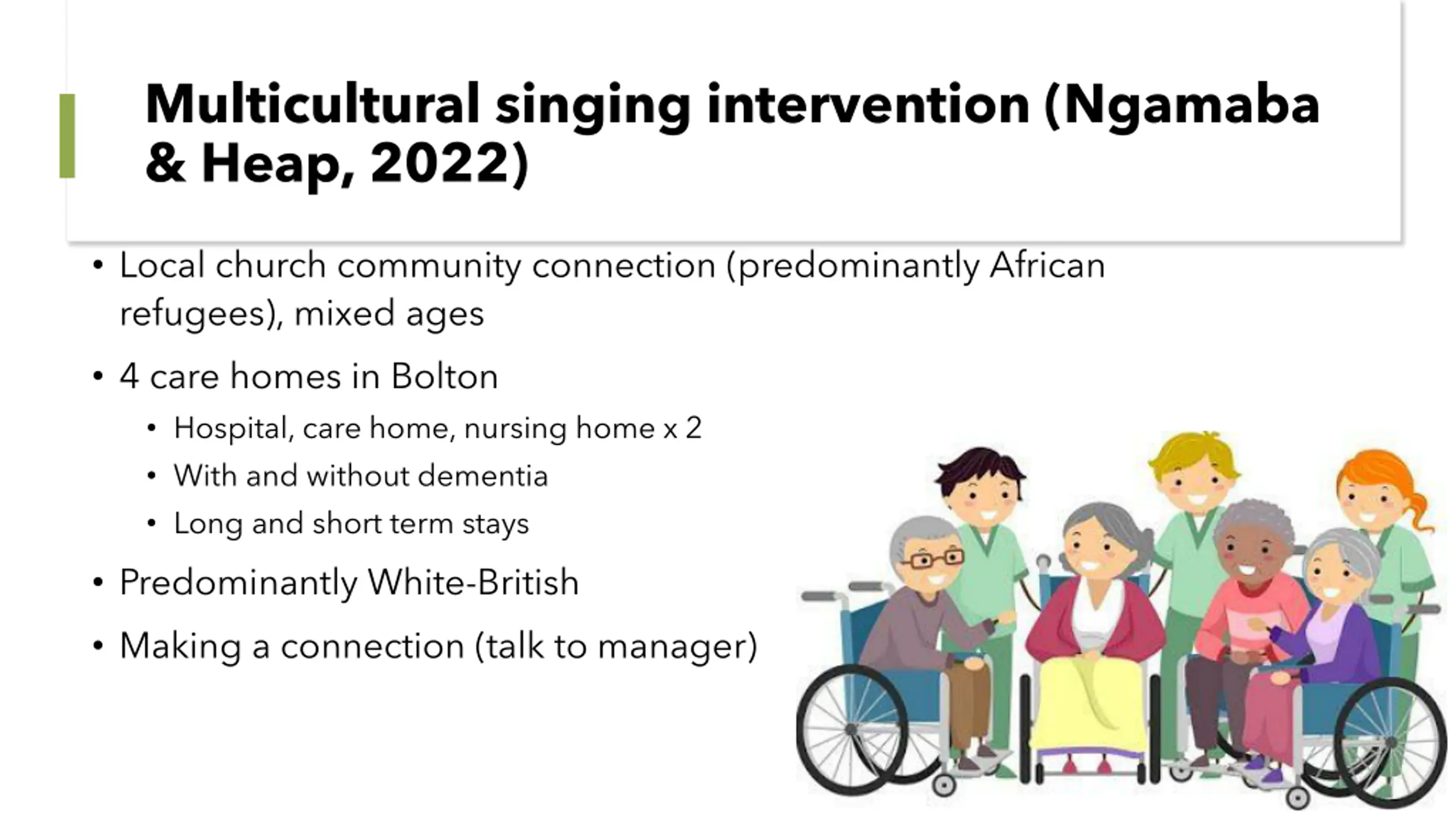 Multicultural singing intervention (Ngamaba & Heap, 2022) Local church community connection (predominantly African refugees), mixed ages 4 care homes in Bolton Hospital, care home, nursing home x 2 With and without dementia Long and short term stays Predominantly White-British Making a connection (talk to manager)