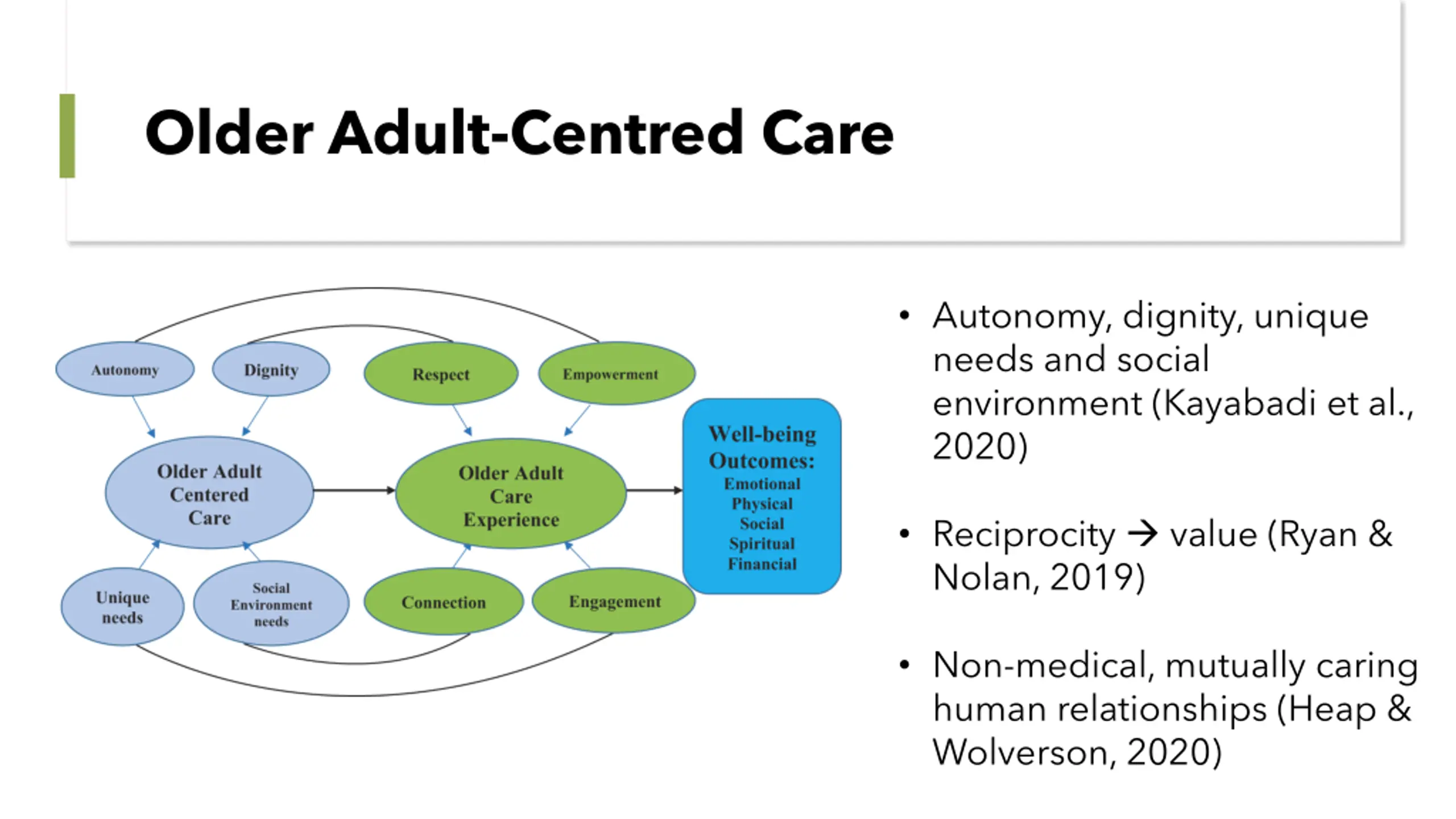 Older Adult-Centred Care Autonomy, dignity, unique needs and social environment (Kayabadi et al., 2020) Reciprocity value (Ryan & Nolan, 2019) Non-medical, mutually caring human relationships (Heap & Wolverson, 2020)