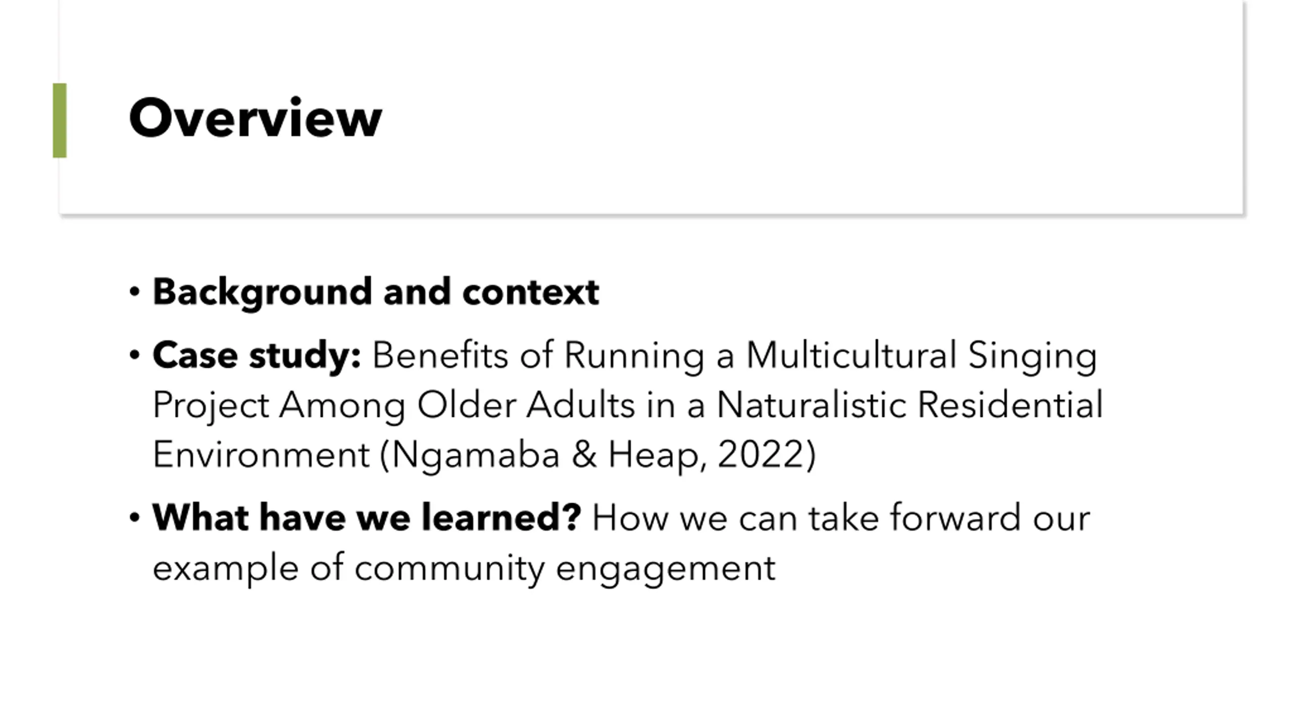 Overview Background and context Case study: Benefits of Running a Multicultural Singing Project Among Older Adults in a Naturalistic Residential Environment (Ngamaba & Heap, 2022) What have we learned? How we can take forward our example of community engagement