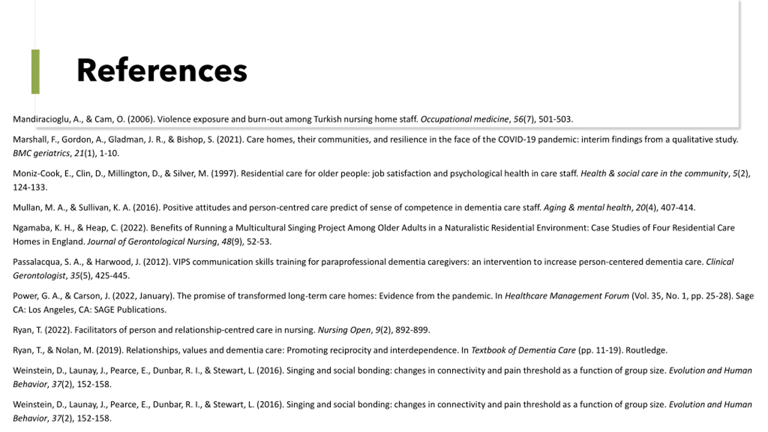 References Mandiracioglu, A., & Cam, O. (2006). Violence exposure and burn-out among Turkish nursing home staff. Occupational medicine, 56(7), 501-503. Marshall, F., Gordon, A., Gladman, J. R., & Bishop, S. (2021). Care homes, their communities, and resilience in the face of the COVID-19 pandemic: interim findings from a qualitative study. BMC geriatrics, 21(1), 1-10. Moniz Cook, E., Clin, D., Millington, D., & Silver, M. (1997). Residential care for older people: job satisfaction and psychological health in care staff. Health & social care in the community, 5(2), 124-133. Mullan, M. A., & Sullivan, K. A. (2016). Positive attitudes and person-centred care predict of sense of competence in dementia care staff. Aging & mental health, 20(4), 407-414. Ngamaba, K. H., & Heap, C. (2022). Benefits of Running a Multicultural Singing Project Among Older Adults in a Naturalistic Residential Environment: Case Studies of Four Residential Care Homes in England. Journal of Gerontological Nursing, 48(9), 52-53. Passalacqua, S. A., & Harwood, J. (2012). VIPS communication skills training for paraprofessional dementia caregivers: an intervention to increase person-centered dementia care. Clinical Gerontologist, 35(5), 425-445. Power, G. A., & Carson, J. (2022, January). The promise of transformed long-term care homes: Evidence from the pandemic. In Healthcare Management Forum (Vol. 35, No. 1, pp. 25-28). Sage CA: Los Angeles, CA: SAGE Publications. Ryan, T. (2022). Facilitators of person and relationship centred care in nursing. Nursing Open, 9(2), 892-899. Ryan, T., & Nolan, M. (2019). Relationships, values and dementia care: Promoting reciprocity and interdependence. In Textbook of Dementia Care (pp. 11-19). Routledge. Weinstein, D., Launay, J., Pearce, E., Dunbar, R. I., & Stewart, L. (2016). Singing and social bonding: changes in connectivity and pain threshold as a function of group size. Evolution and Human Behavior, 37(2), 152-158. Weinstein, D., Launay, J., Pearce, E., Dunbar, R. I., & Stewart, L. (2016). Singing and social bonding: changes in connectivity and pain threshold as a function of group size. Evolution and Human Behavior, 37(2), 152-158.