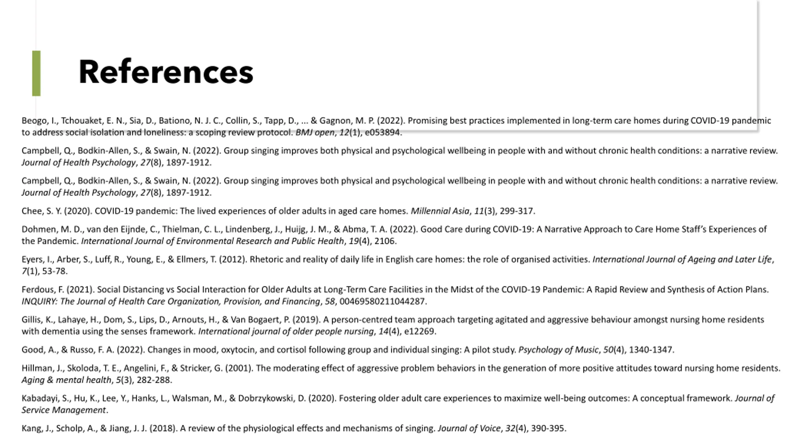 References Beogo, I., Tchouaket, E. N., Sia, D., Bationo, N. J. C., Collin, S., Tapp, D., ... & Gagnon, M. P. (2022). Promising best practices implemented in long-term care homes during COVID-19 pandemic to address social isolation and loneliness: a scoping review protocol. BMJ open, 12(1), e053894. Campbell, Q., Bodkin-Allen, S., & Swain, N. (2022). Group singing improves both physical and psychological wellbeing in people with and without chronic health conditions: a narrative review. Journal of Health Psychology, 27(8), 1897-1912. Campbell, Q., Bodkin-Allen, S., & Swain, N. (2022). Group singing improves both physical and psychological wellbeing in people with and without chronic health conditions: a narrative review. Journal of Health Psychology, 27(8), 1897-1912. Chee, S. Y. (2020). COVID-19 pandemic: The lived experiences of older adults in aged care homes. Millennial Asia, 11(3), 299-317. Dohmen, M. D., van den Eijnde, C., Thielman, C. L., Lindenberg, J., Huijg, J. M., & Abma, T. A. (2022). Good Care during COVID-19: A Narrative Approach to Care Home Staff s Experiences of the Pandemic. International Journal of Environmental Research and Public Health, 19(4), 2106. Eyers, I., Arber, S., Luff, R., Young, E., & Ellmers, T. (2012). Rhetoric and reality of daily life in English care homes: the role of organised activities. International Journal of Ageing and Later Life, 7(1), 53-78. Ferdous, F. (2021). Social Distancing vs Social Interaction for Older Adults at Long-Term Care Facilities in the Midst of the COVID-19 Pandemic: A Rapid Review and Synthesis of Action Plans. INQUIRY: The Journal of Health Care Organization, Provision, and Financing, 58, 00469580211044287. Gillis, K., Lahaye, H., Dom, S., Lips, D., Arnouts, H., & Van Bogaert, P. (2019). A person centred team approach targeting agitated and aggressive behaviour amongst nursing home residents with dementia using the senses framework. International journal of older people nursing, 14(4), e12269. Good, A., & Russo, F. A. (2022). Changes in mood, oxytocin, and cortisol following group and individual singing: A pilot study. Psychology of Music, 50(4), 1340-1347. Hillman, J., Skoloda, T. E., Angelini, F., & Stricker, G. (2001). The moderating effect of aggressive problem behaviors in the generation of more positive attitudes toward nursing home residents. Aging & mental health, 5(3), 282-288. Kabadayi, S., Hu, K., Lee, Y., Hanks, L., Walsman, M., & Dobrzykowski, D. (2020). Fostering older adult care experiences to maximize well-being outcomes: A conceptual framework. Journal of Service Management. Kang, J., Scholp, A., & Jiang, J. J. (2018). A review of the physiological effects and mechanisms of singing. Journal of Voice, 32(4), 390-395.