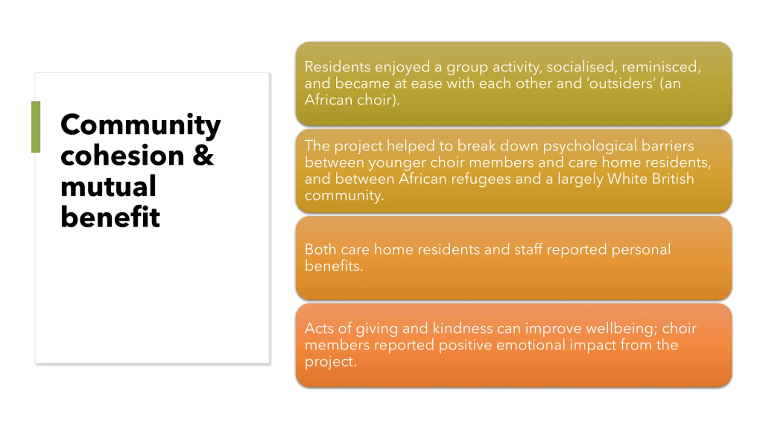 Residents enjoyed a group activity, socialised, reminisced, and became at ease with each other and outsiders (an African choir). Community cohesion & mutual benefit The project helped to break down psychological barriers between younger choir members and care home residents, and between African refugees and a largely White British community. Both care home residents and staff reported personal benefits. Acts of giving and kindness can improve wellbeing; choir members reported positive emotional impact from the project.