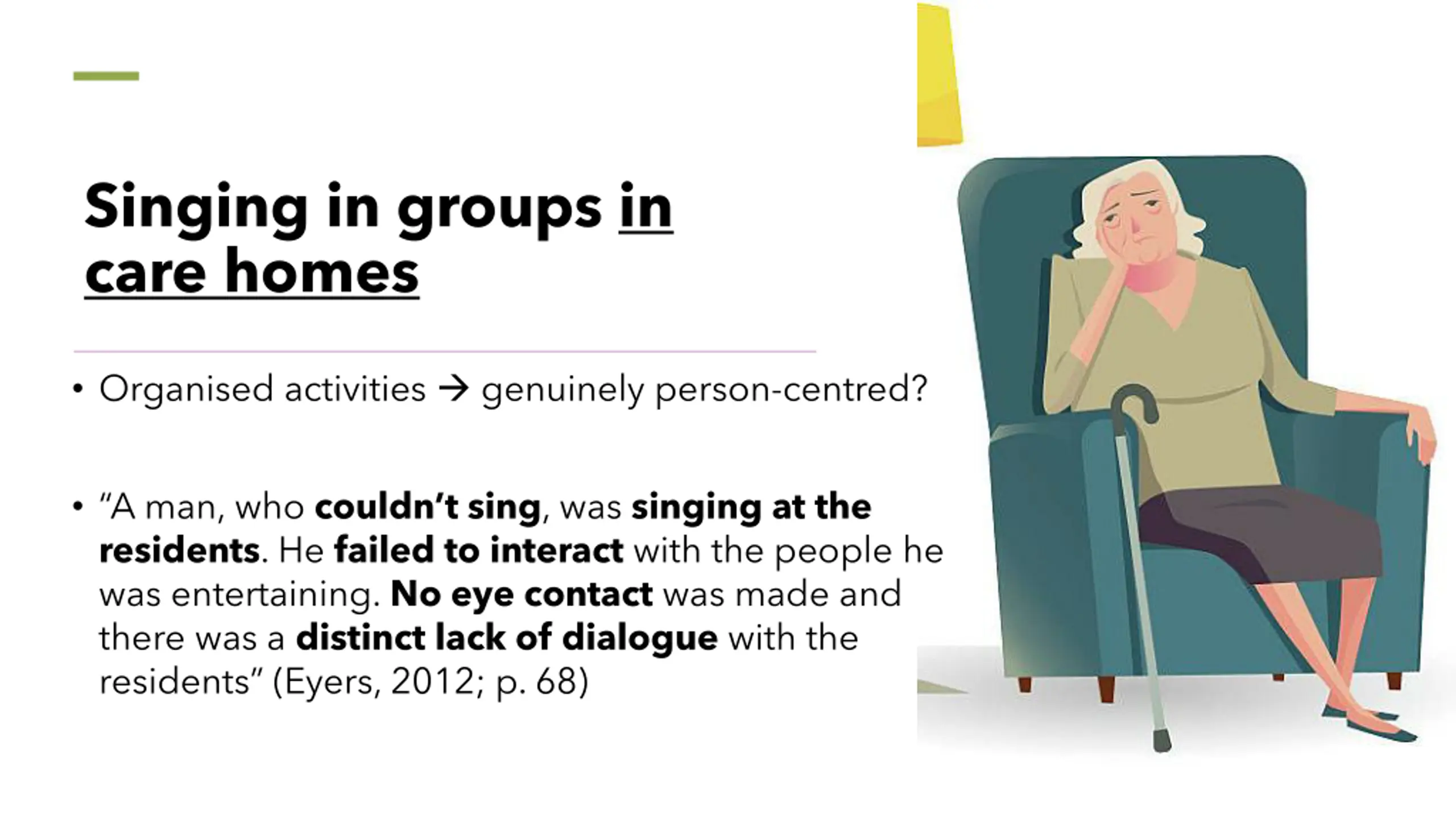 Singing in groups in care homes Organised activities genuinely person-centred? A man, who couldn t sing, was singing at the residents. He failed to interact with the people he was entertaining. No eye contact was made and there was a distinct lack of dialogue with the residents (Eyers, 2012; p. 68)