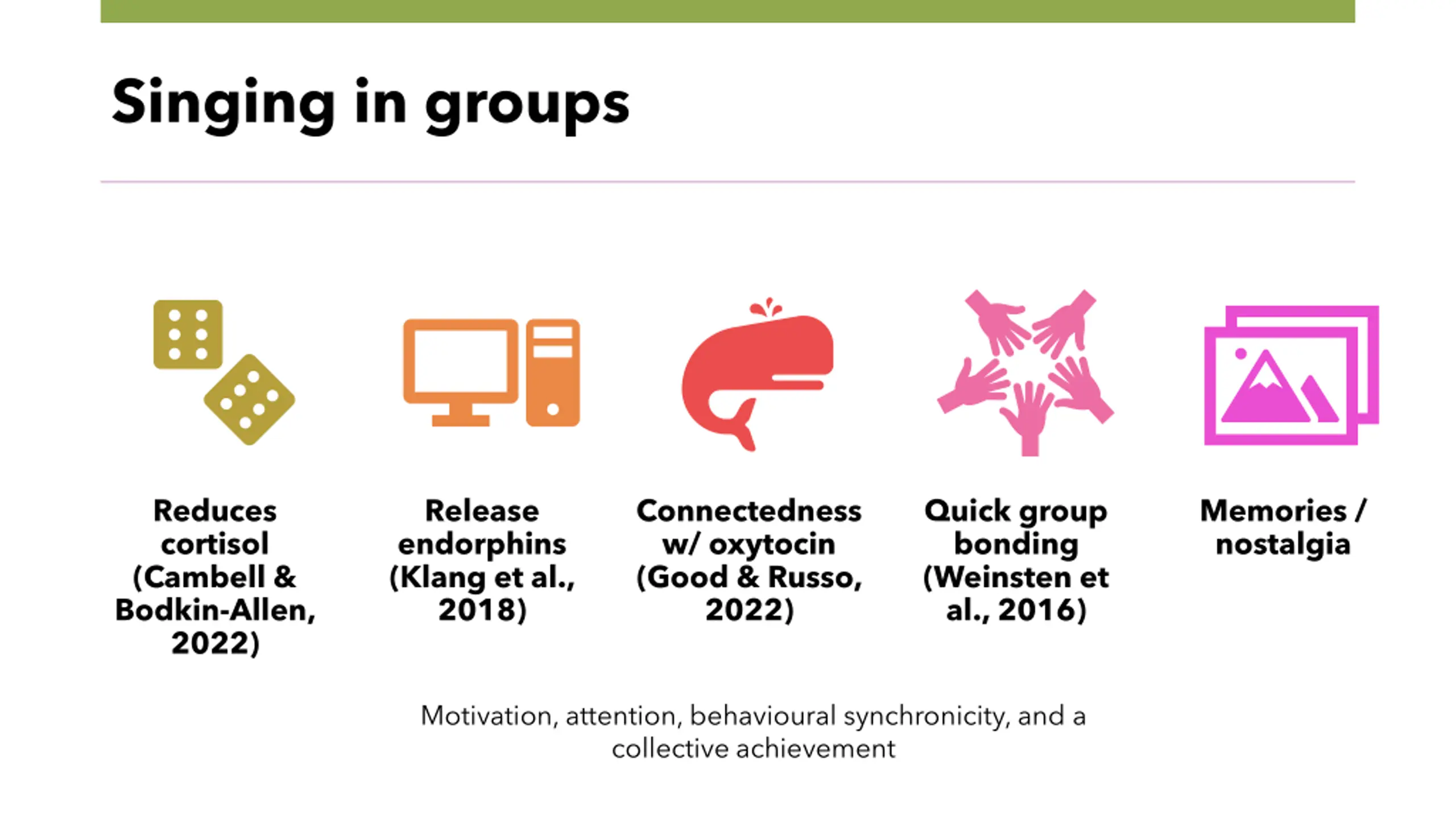 Singing in groups Reduces cortisol (Cambell & Bodkin-Allen, 2022) Release endorphins (Klang et al., 2018) Connectedness w/ oxytocin (Good & Russo, 2022) Quick group bonding (Weinsten et al., 2016) Memories / nostalgia Motivation, attention, behavioural synchronicity, and a collective achievement