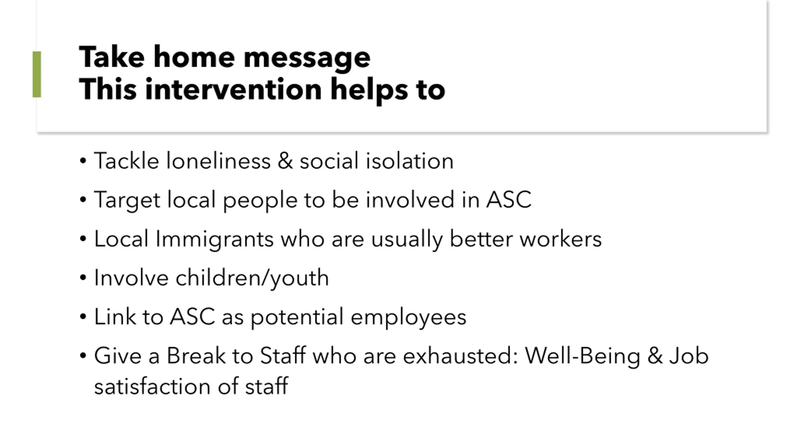 Take home message This intervention helps to Tackle loneliness & social isolation Target local people to be involved in ASC Local Immigrants who are usually better workers Involve children/youth Link to ASC as potential employees Give a Break to Staff who are exhausted: Well-Being & Job satisfaction of staff