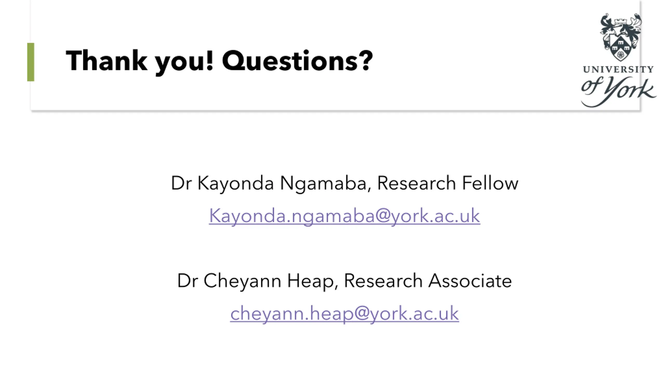 Thank you! Questions? Dr Kayonda Ngamaba, Research Fellow Kayonda.ngamaba@york.ac.uk Dr Cheyann Heap, Research Associate cheyann.heap@york.ac.uk