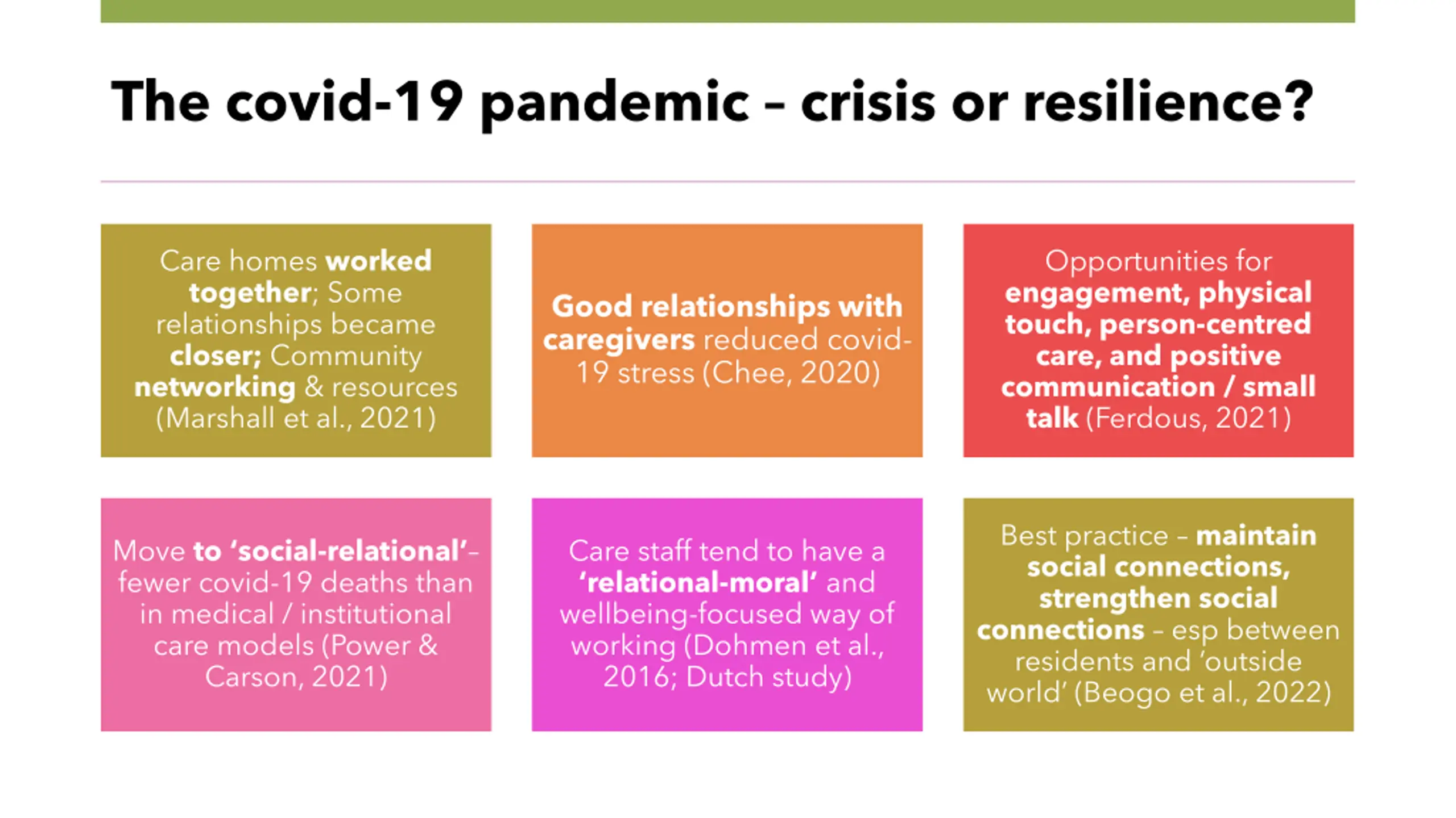 The covid-19 pandemic crisis or resilience? Care homes worked together; Some relationships became closer; Community networking & resources (Marshall et al., 2021) Opportunities for engagement, physical touch, person-centred care, and positive communication / small talk (Ferdous, 2021) Good relationships with caregivers reduced covid- 19 stress (Chee, 2020) Best practice maintain social connections, strengthen social connections esp between residents and outside world (Beogo et al., 2022) Move to social-relational fewer covid-19 deaths than in medical / institutional care models (Power & Carson, 2021) Care staff tend to have a relational-moral and wellbeing-focused way of working (Dohmen et al., 2016; Dutch study)