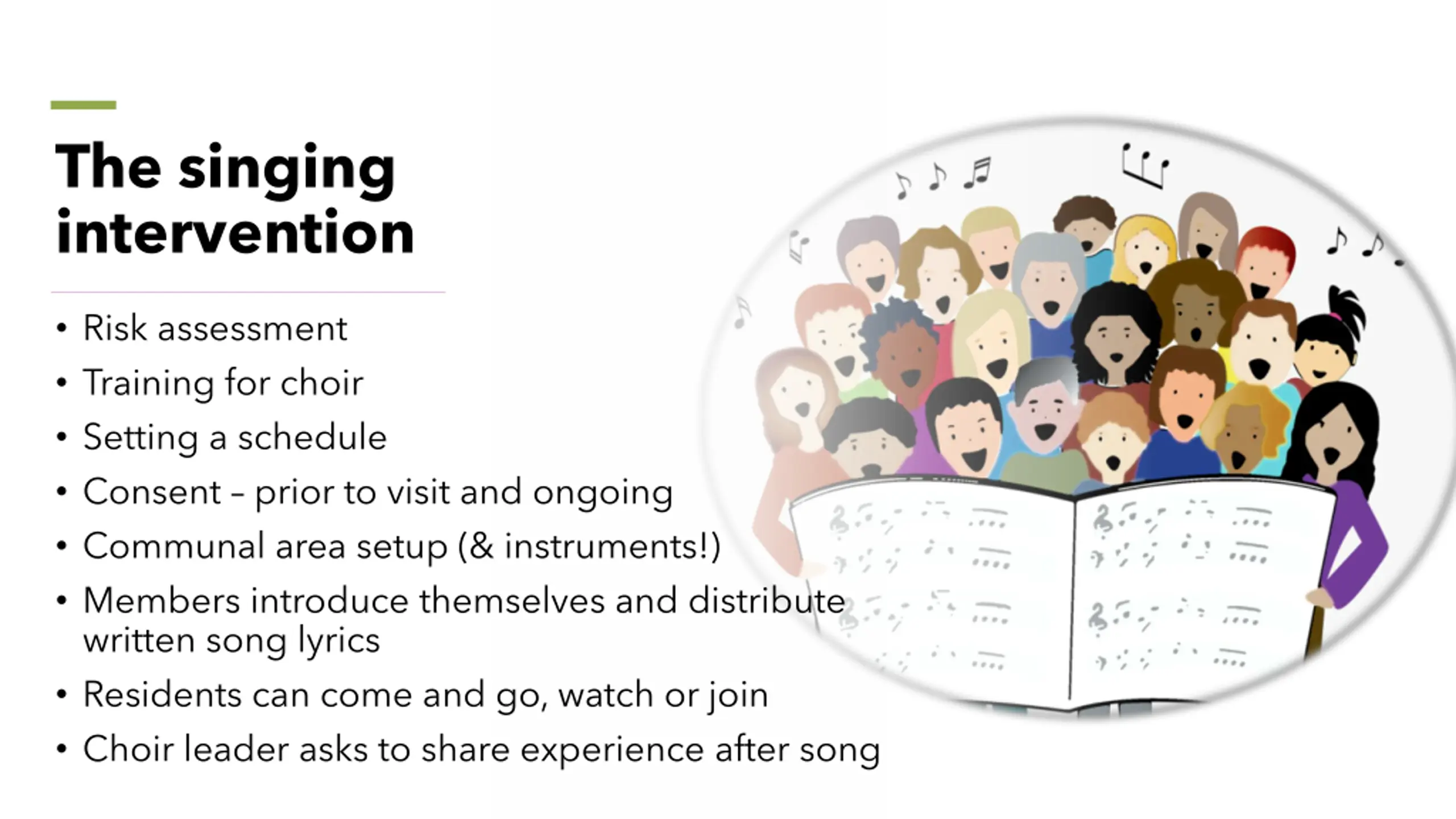 The singing intervention Risk assessment Training for choir Setting a schedule Consent prior to visit and ongoing Communal area setup (& instruments!) Members introduce themselves and distribute written song lyrics Residents can come and go, watch or join Choir leader asks to share experience after song