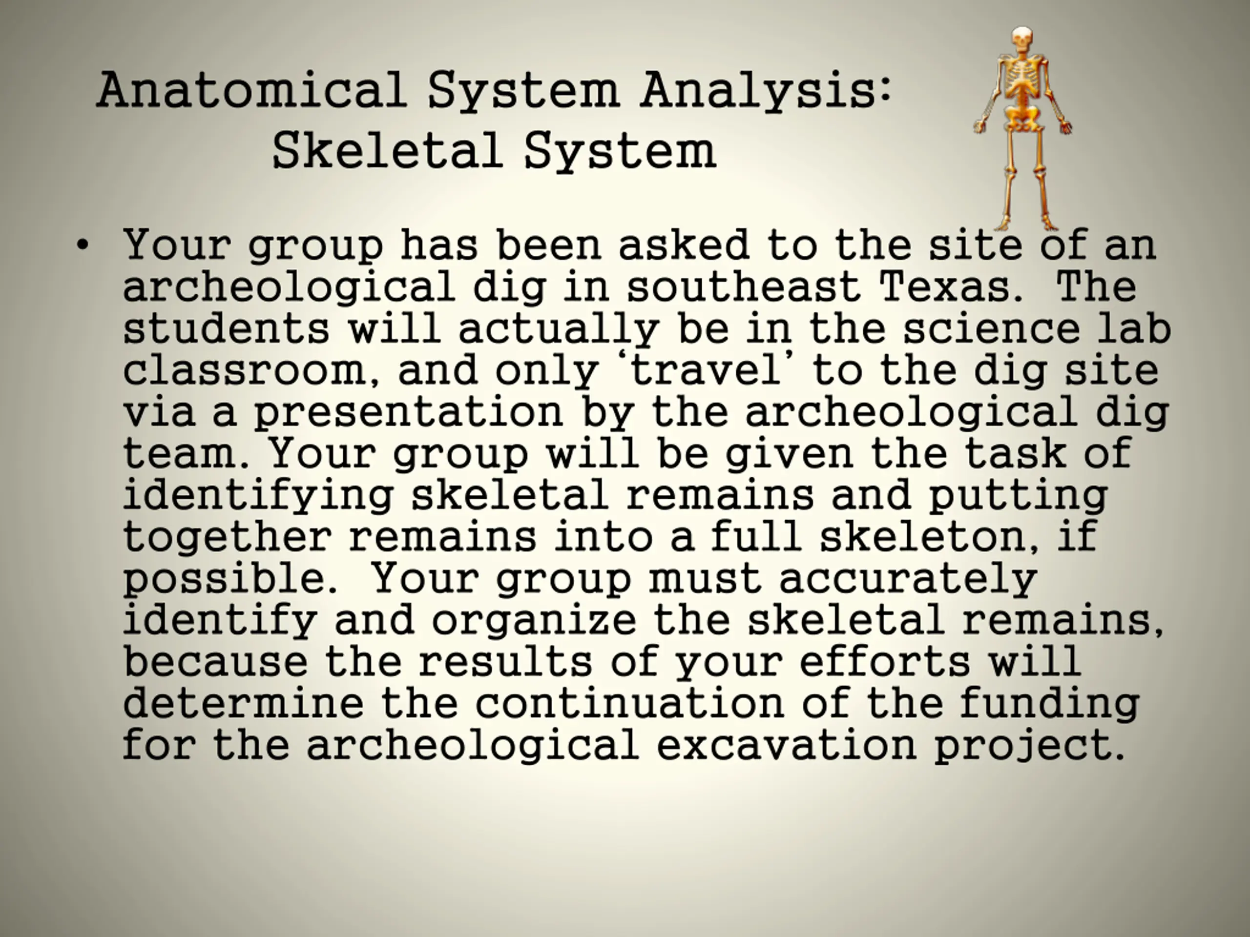 Anatomical System Analysis: Skeletal System Your group has been asked to the site of an archeological dig in southeast Texas. The students will actually be in the science lab classroom, and only travel to the dig site via a presentation by the archeological dig team. Your group will be given the task of identifying skeletal remains and putting together remains into a full skeleton, if possible. Your group must accurately identify and organize the skeletal remains, because the results of your efforts will determine the continuation of the funding for the archeological excavation project.