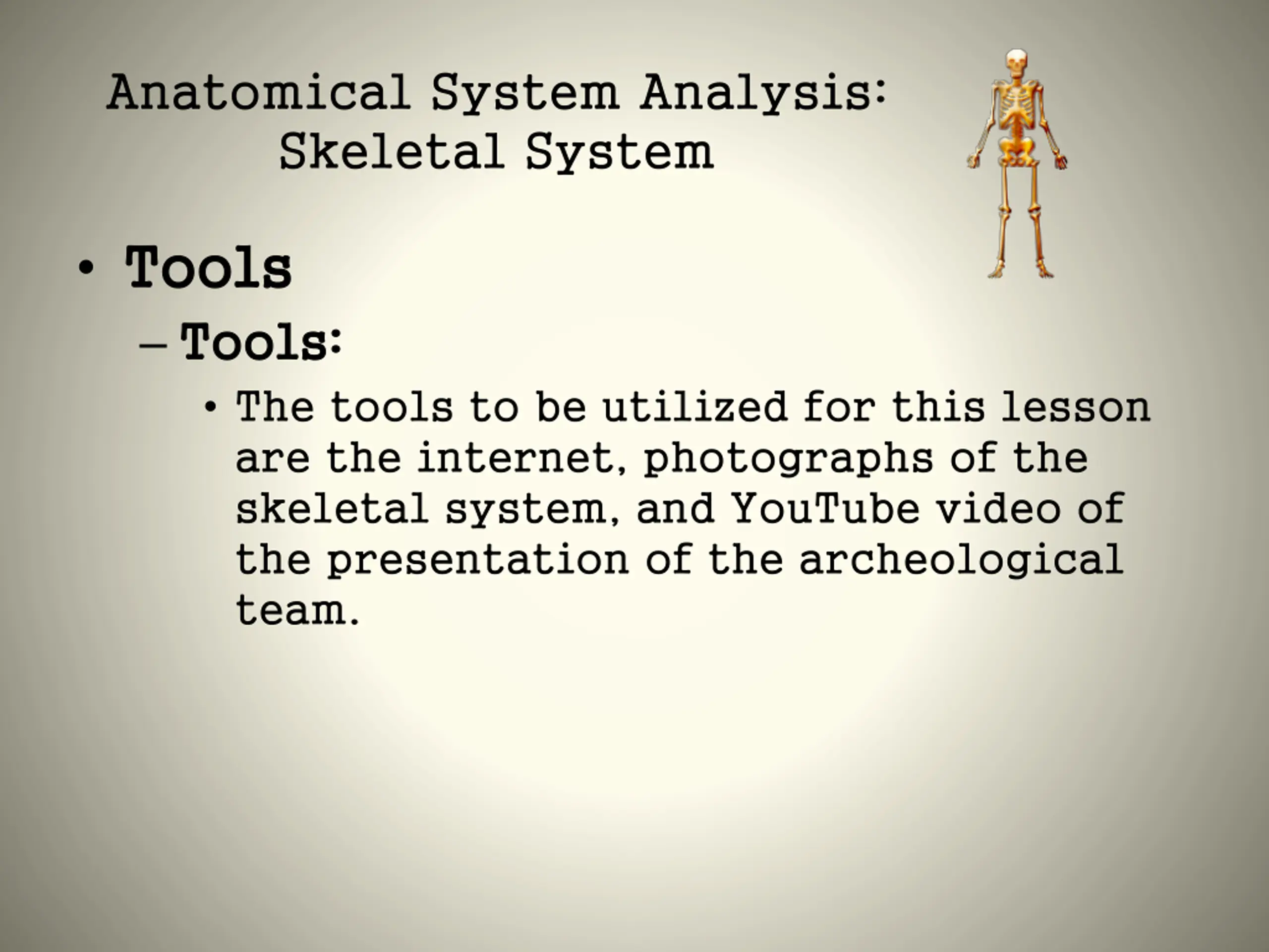Anatomical System Analysis: Skeletal System Tools Tools Tools: Tools: The tools to be utilized for this lesson are the internet, photographs of the skeletal system, and YouTube video of the presentation of the archeological team.