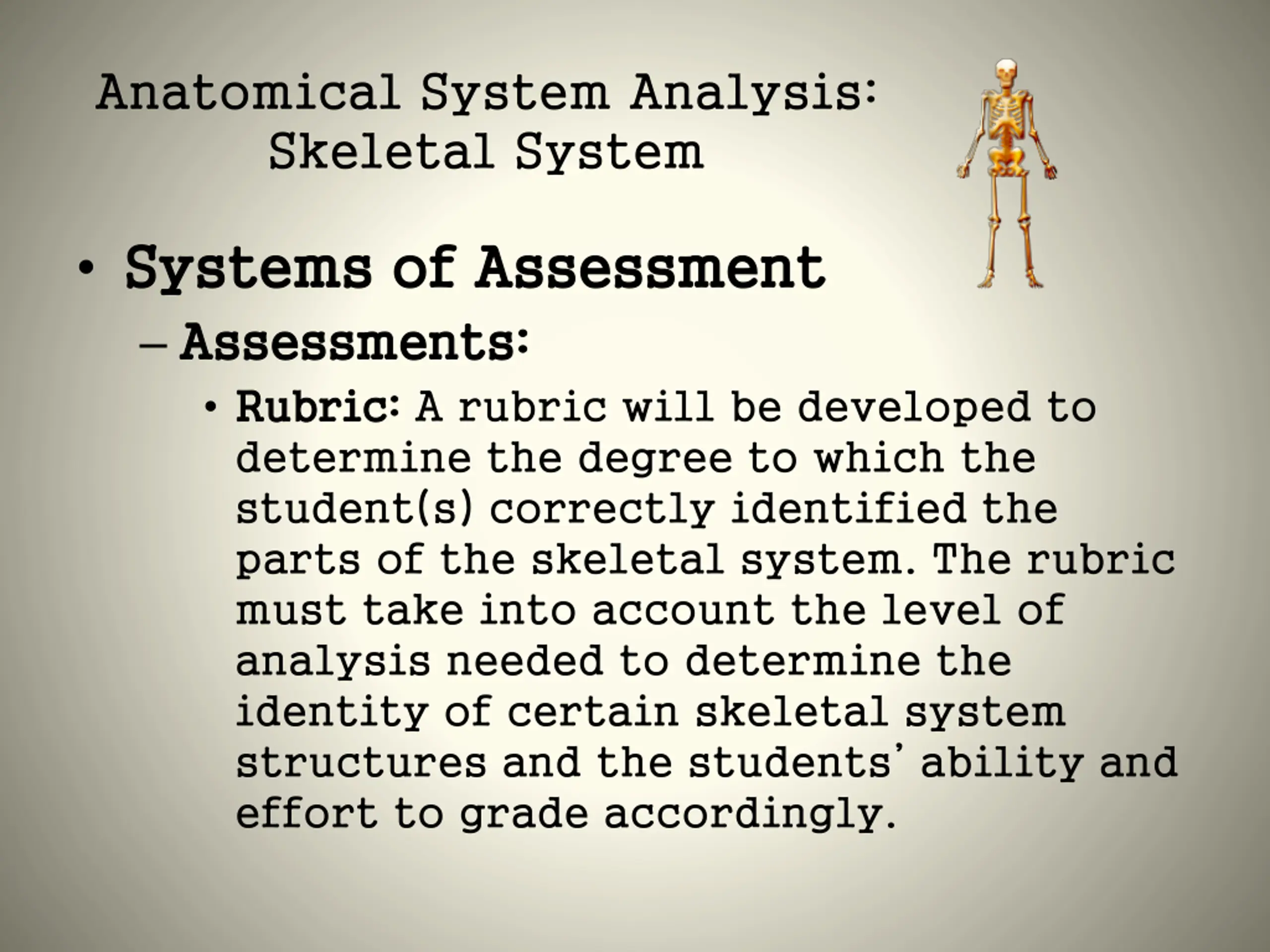 Anatomical System Analysis: Skeletal System Systems of Assessment Systems of Assessment Assessments: Assessments: Rubric: Rubric: A rubric will be developed to determine the degree to which the student(s) correctly identified the parts of the skeletal system. The rubric must take into account the level of analysis needed to determine the identity of certain skeletal system structures and the students ability and effort to grade accordingly.