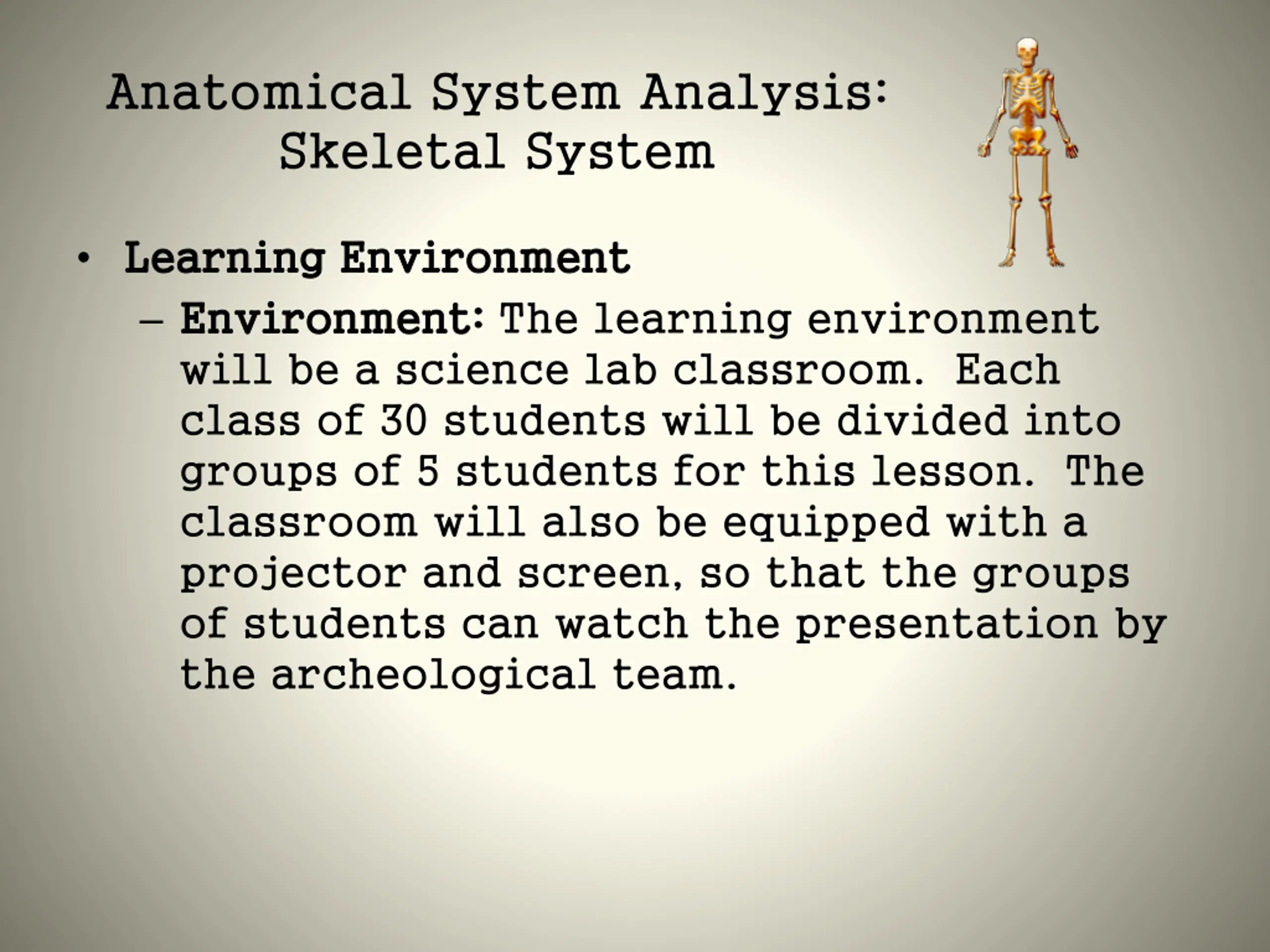Anatomical System Analysis: Skeletal System Learning Environment Learning Environment Environment: Environment: The learning environment will be a science lab classroom. Each class of 30 students will be divided into groups of 5 students for this lesson. The classroom will also be equipped with a projector and screen, so that the groups of students can watch the presentation by the archeological team.