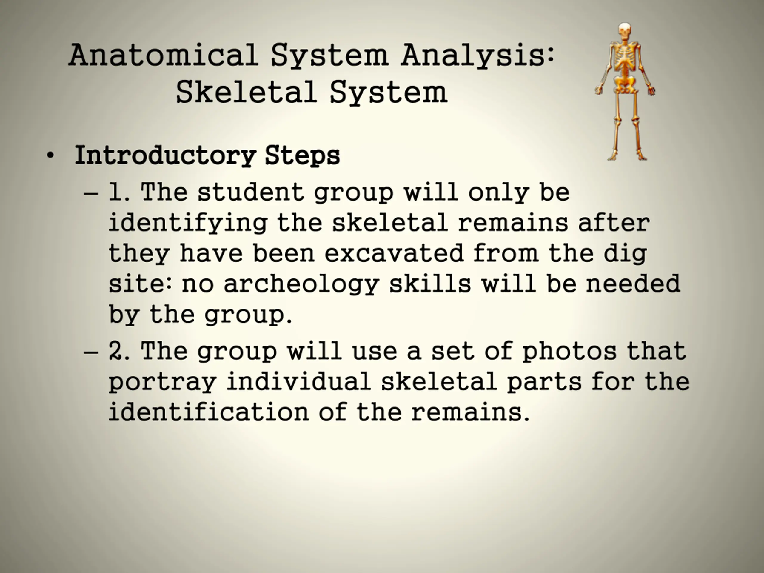 Anatomical System Analysis: Skeletal System Introductory Introductory Steps 1. The student group will only be identifying the skeletal remains after they have been excavated from the dig site: no archeology skills will be needed by the group. 2. The group will use a set of photos that portray individual skeletal parts for the identification of the remains. Steps
