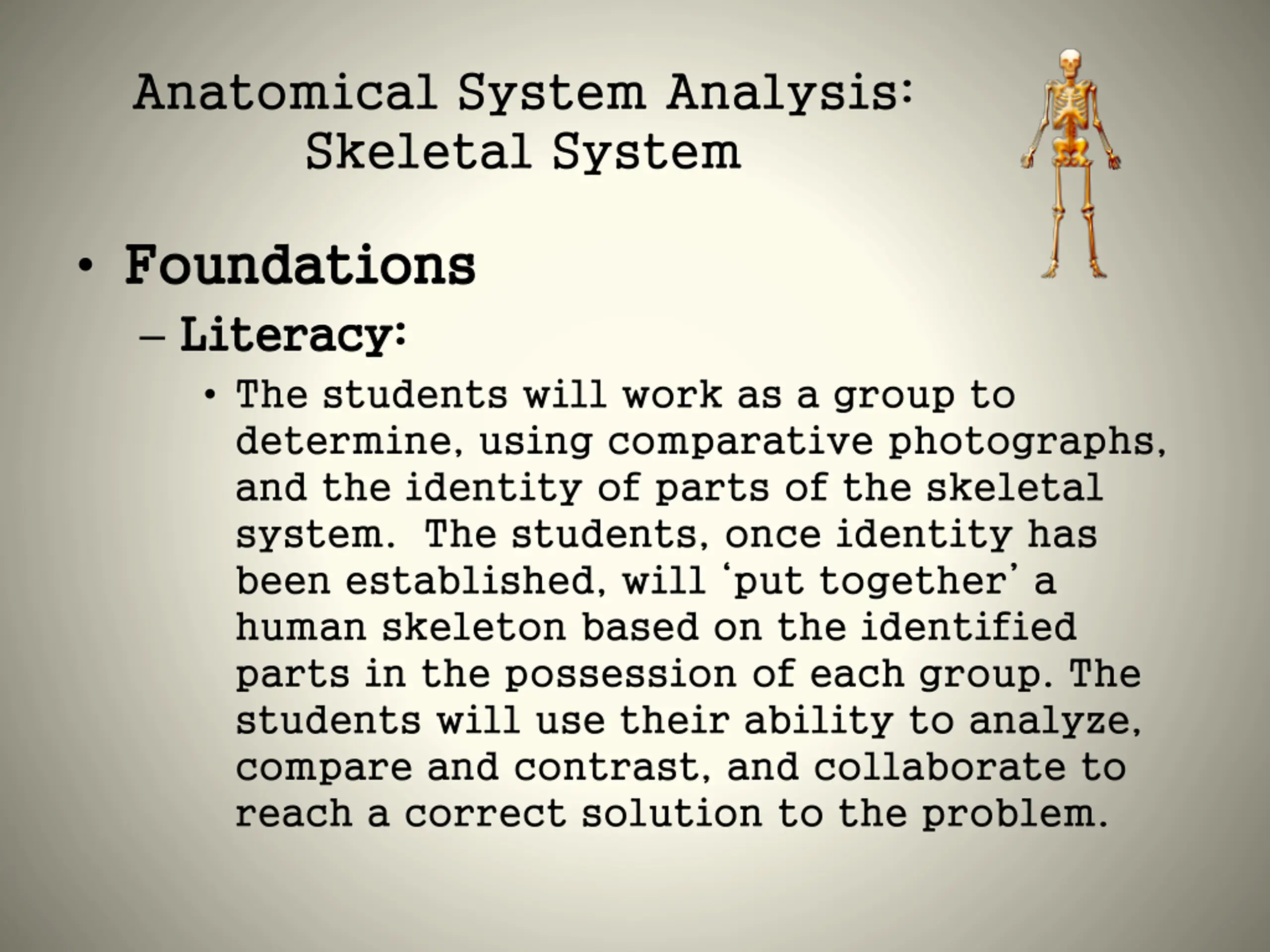 Anatomical System Analysis: Skeletal System Foundations Foundations Literacy: Literacy: The students will work as a group to determine, using comparative photographs, and the identity of parts of the skeletal system. The students, once identity has been established, will put together a human skeleton based on the identified parts in the possession of each group. The students will use their ability to analyze, compare and contrast, and collaborate to reach a correct solution to the problem.