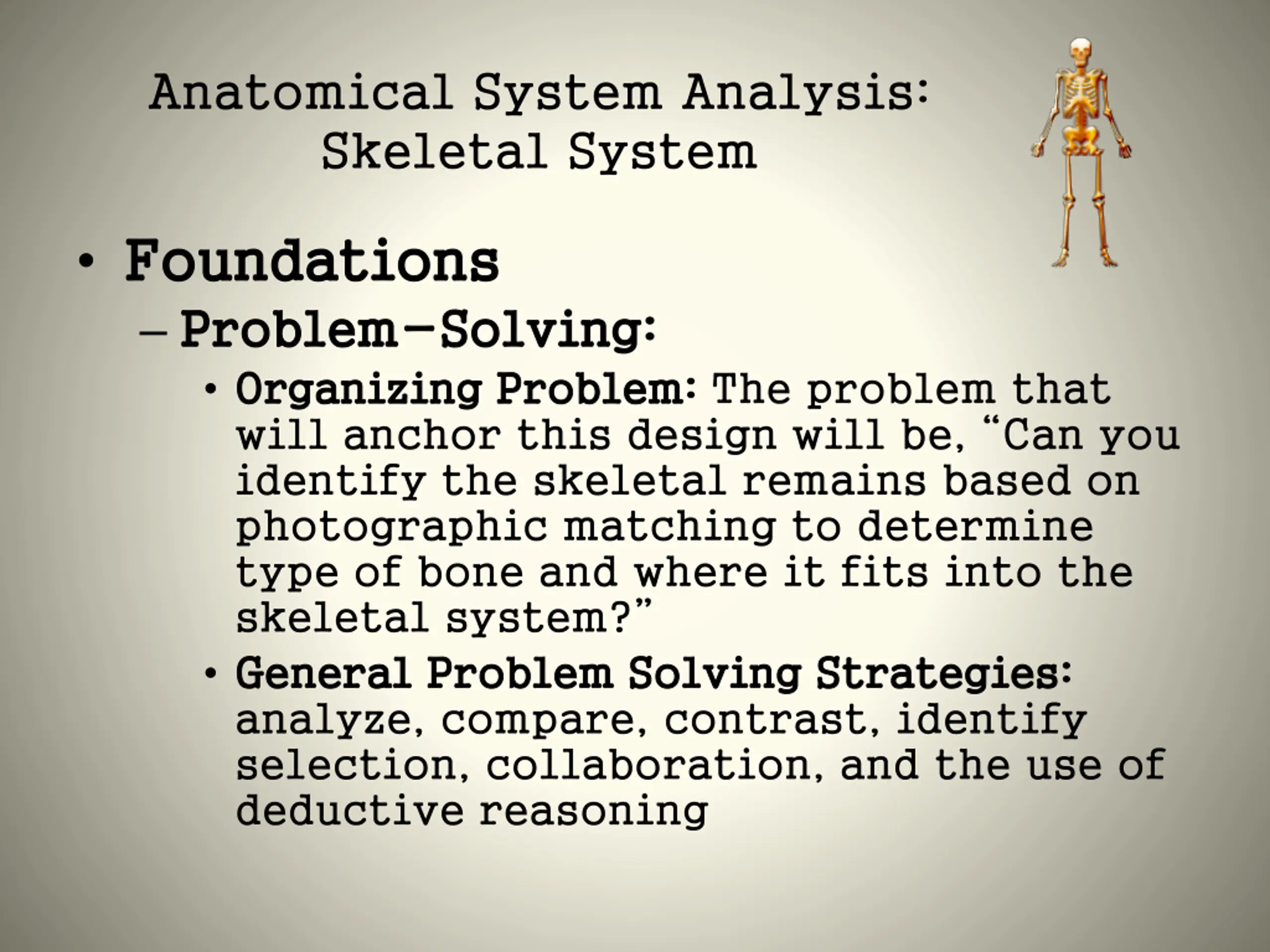 Anatomical System Analysis: Skeletal System Foundations Foundations Problem Problem- -Solving: Organizing Problem: Organizing Problem: The problem that will anchor this design will be, Can you identify the skeletal remains based on photographic matching to determine type of bone and where it fits into the skeletal system? General Problem Solving Strategies: General Problem Solving Strategies: analyze, compare, contrast, identify selection, collaboration, and the use of deductive reasoning Solving: