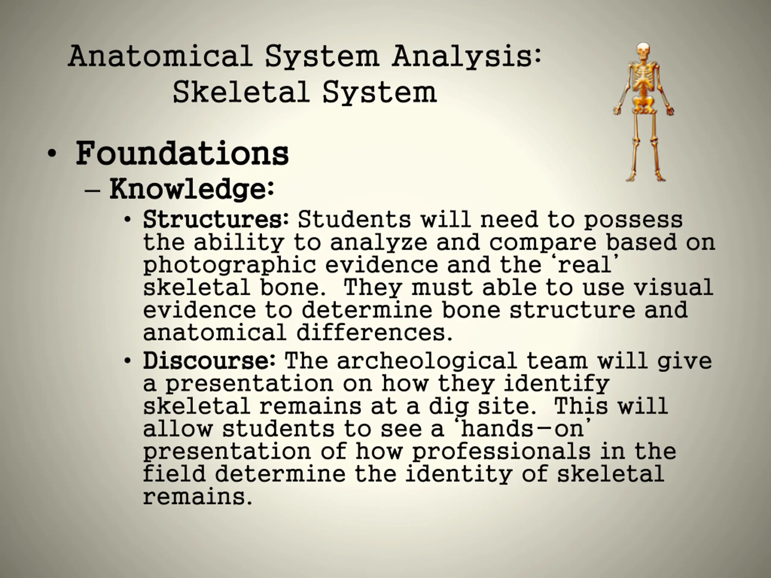 Anatomical System Analysis: Skeletal System Foundations Foundations Knowledge Knowledge: : Structures: Structures: Students will need to possess the ability to analyze and compare based on photographic evidence and the real skeletal bone. They must able to use visual evidence to determine bone structure and anatomical differences. Discourse: Discourse: The archeological team will give a presentation on how they identify skeletal remains at a dig site. This will allow students to see a hands-on presentation of how professionals in the field determine the identity of skeletal remains.