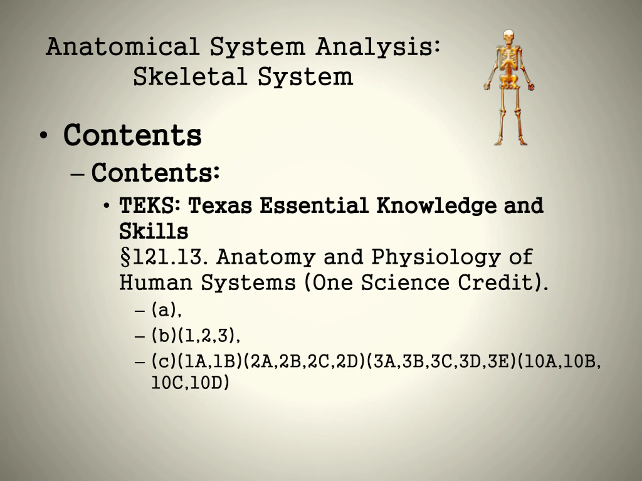 Anatomical System Analysis: Skeletal System Contents Contents Contents: Contents: TEKS TEKS: Texas Essential Knowledge and : Texas Essential Knowledge and Skills Skills 121.13. Anatomy and Physiology of Human Systems (One Science Credit). (a), (b)(1,2,3), (c)(1A,1B)(2A,2B,2C,2D)(3A,3B,3C,3D,3E)(10A,10B, 10C,10D)
