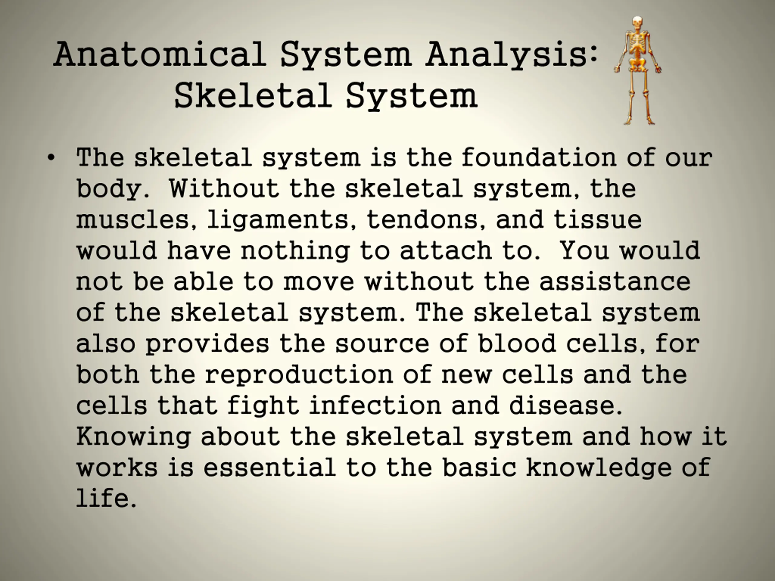 Anatomical System Analysis: Skeletal System The skeletal system is the foundation of our body. Without the skeletal system, the muscles, ligaments, tendons, and tissue would have nothing to attach to. You would not be able to move without the assistance of the skeletal system. The skeletal system also provides the source of blood cells, for both the reproduction of new cells and the cells that fight infection and disease. Knowing about the skeletal system and how it works is essential to the basic knowledge of life.