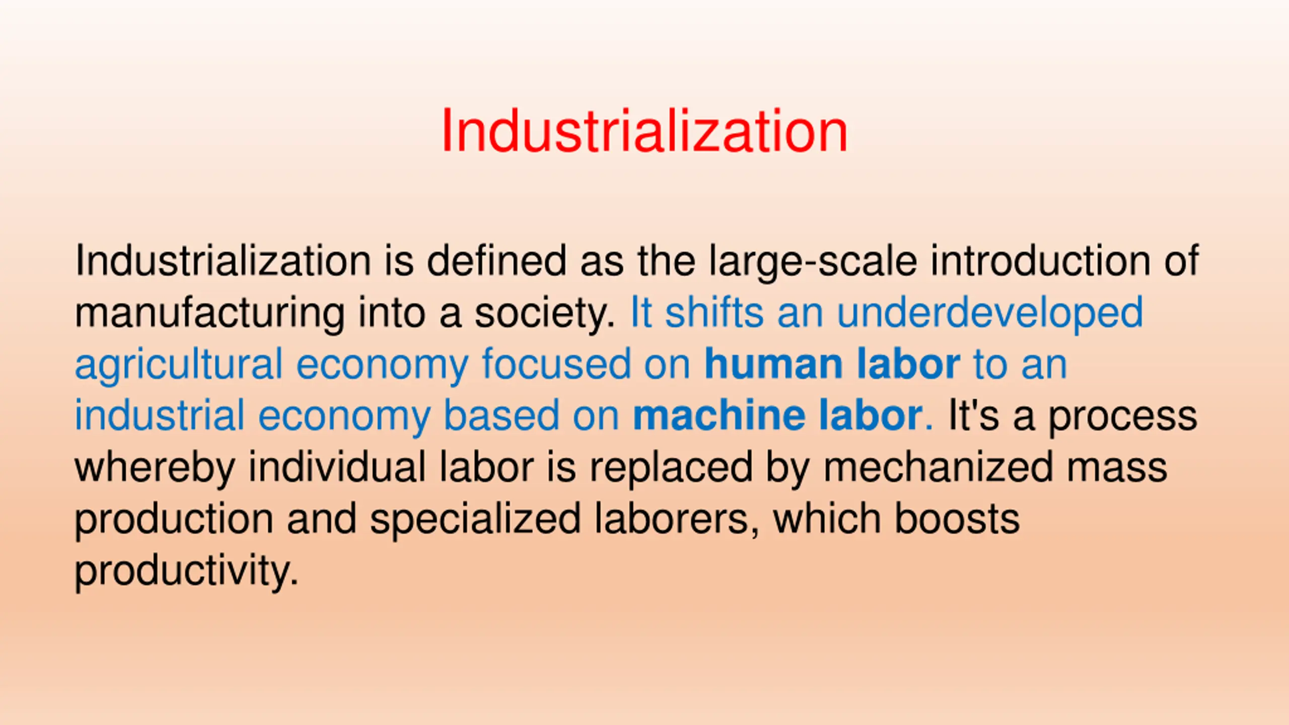 Industrialization Industrialization is defined as the large-scale introduction of manufacturing into a society. It shifts an underdeveloped agricultural economy focused on human labor to an industrial economy based on machine labor. It's a process whereby individual labor is replaced by mechanized mass production and specialized laborers, which boosts productivity.