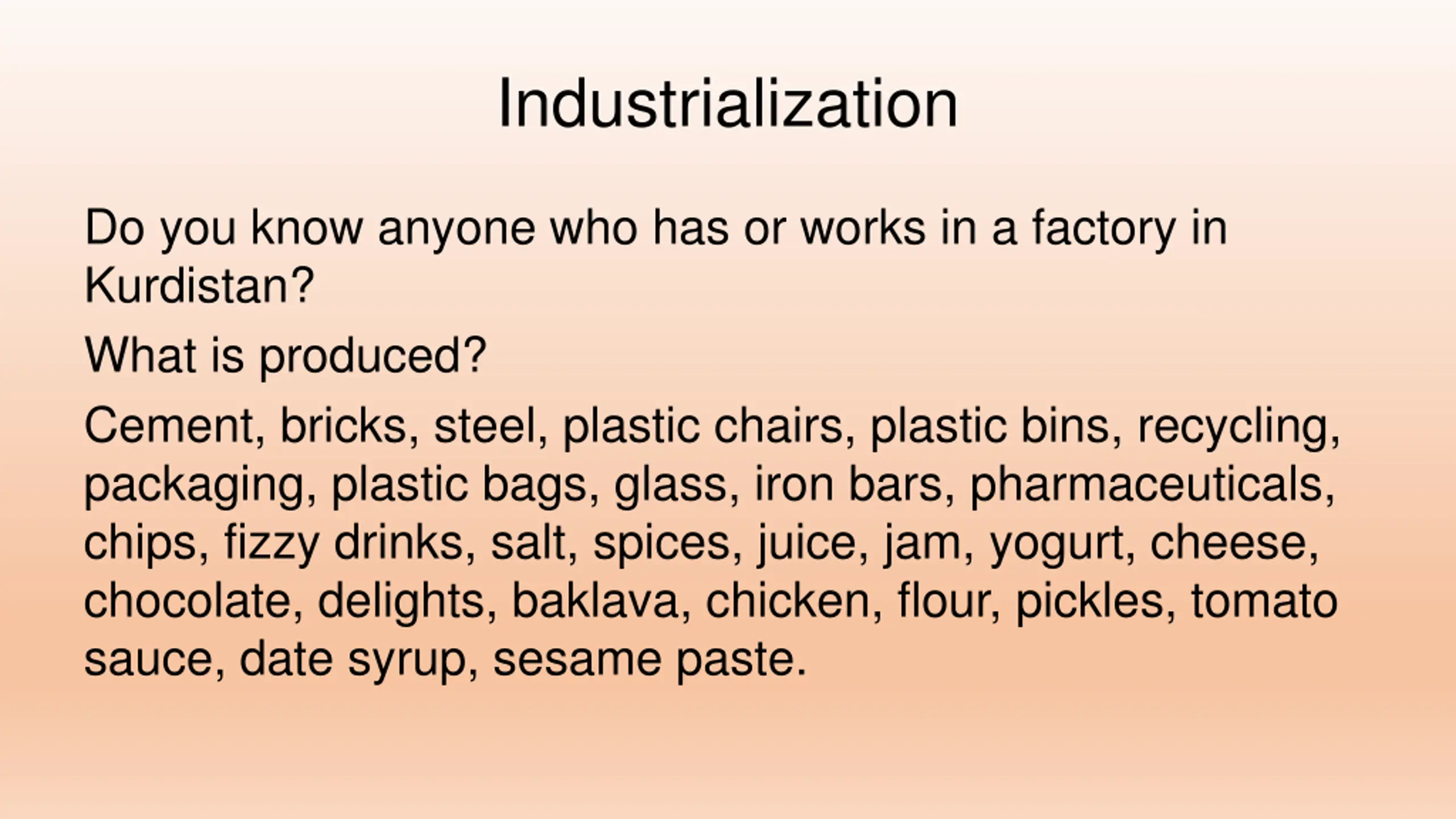 Industrialization Do you know anyone who has or works in a factory in Kurdistan? What is produced? Cement, bricks, steel, plastic chairs, plastic bins, recycling, packaging, plastic bags, glass, iron bars, pharmaceuticals, chips, fizzy drinks, salt, spices, juice, jam, yogurt, cheese, chocolate, delights, baklava, chicken, flour, pickles, tomato sauce, date syrup, sesame paste.