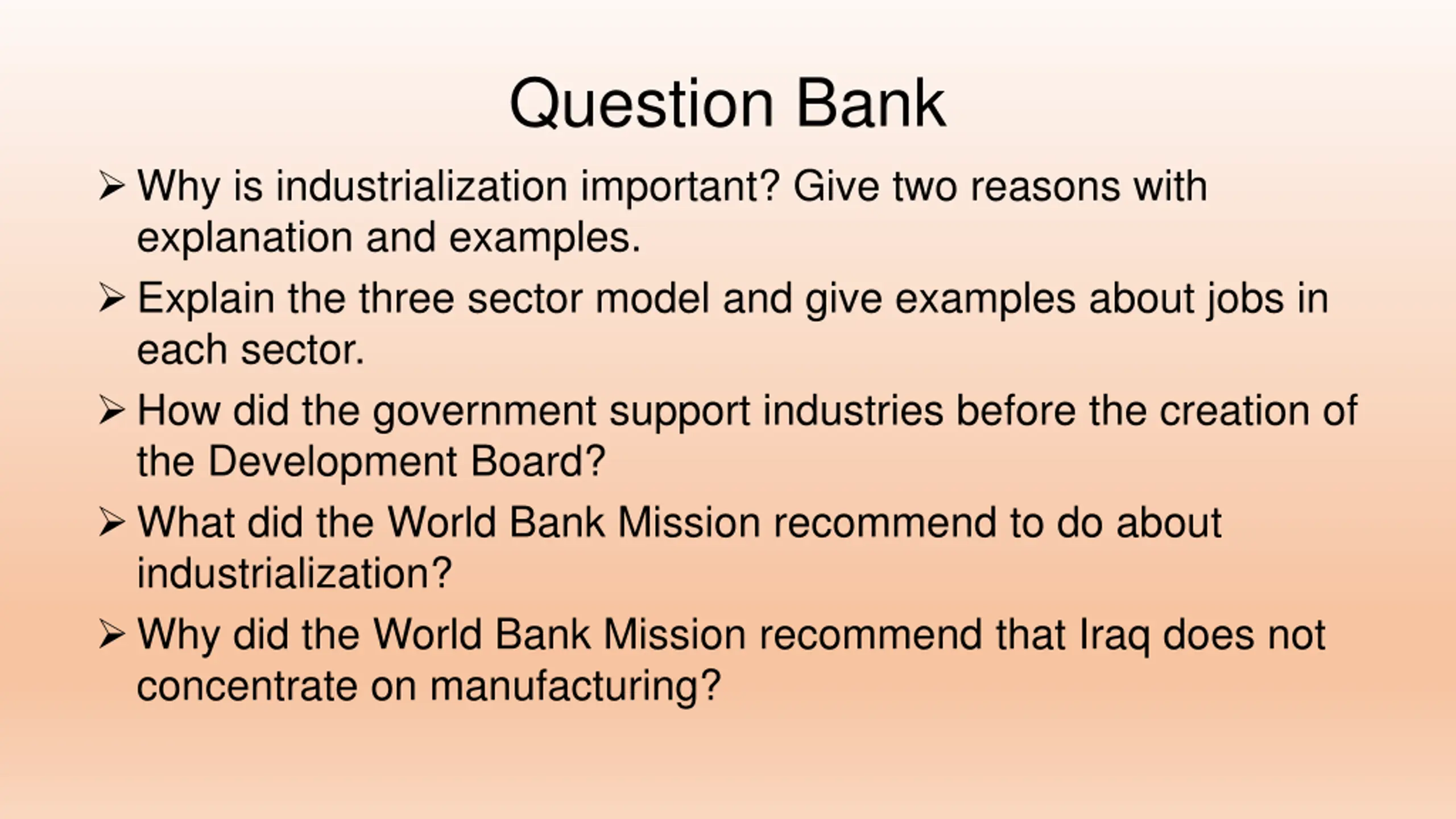 Question Bank Why is industrialization important? Give two reasons with explanation and examples. Explain the three sector model and give examples about jobs in each sector. How did the government support industries before the creation of the Development Board? What did the World Bank Mission recommend to do about industrialization? Why did the World Bank Mission recommend that Iraq does not concentrate on manufacturing?