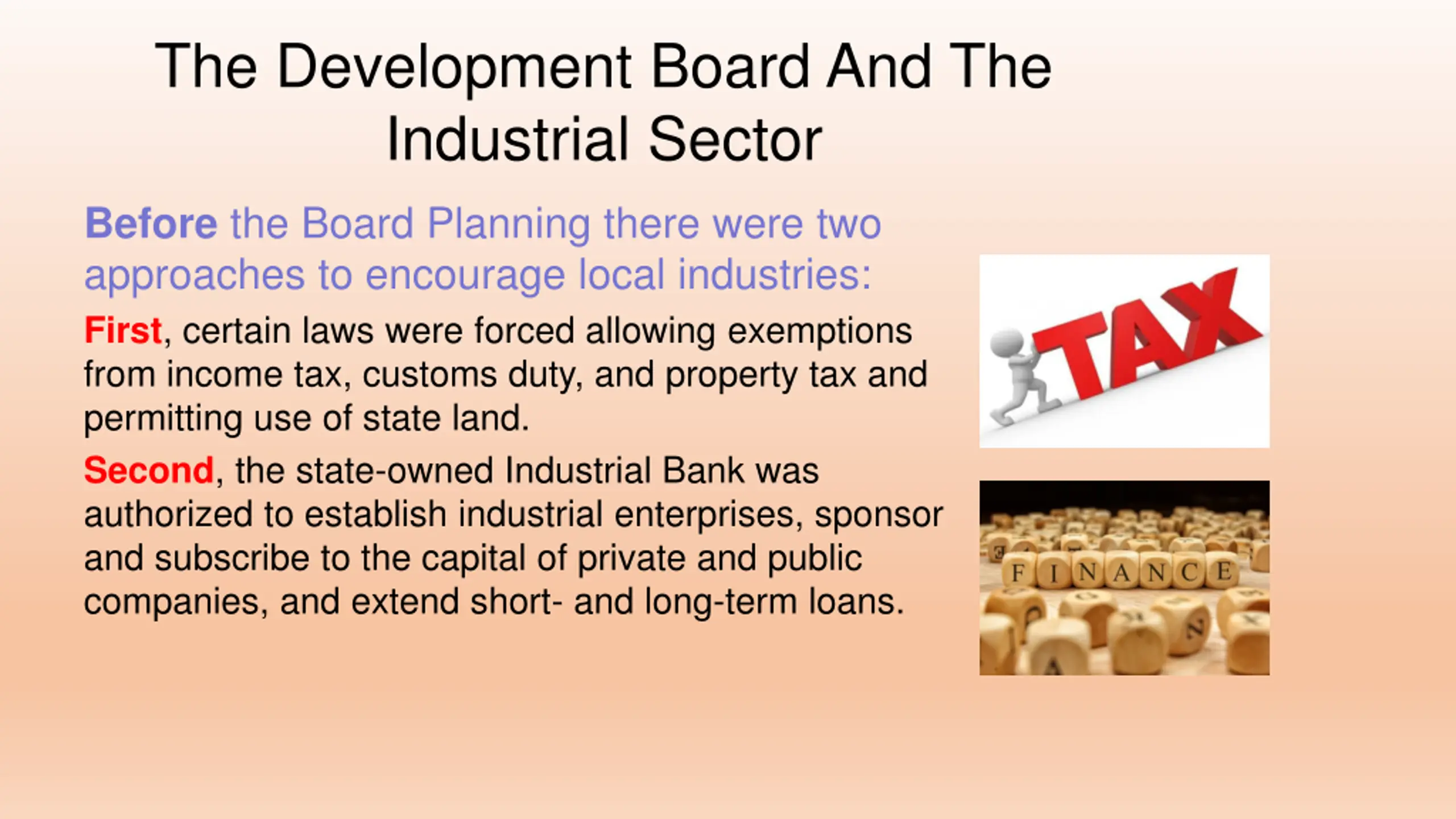 The Development Board And The Industrial Sector Before the Board Planning there were two approaches to encourage local industries: First, certain laws were forced allowing exemptions from income tax, customs duty, and property tax and permitting use of state land. Second, the state-owned Industrial Bank was authorized to establish industrial enterprises, sponsor and subscribe to the capital of private and public companies, and extend short- and long-term loans.