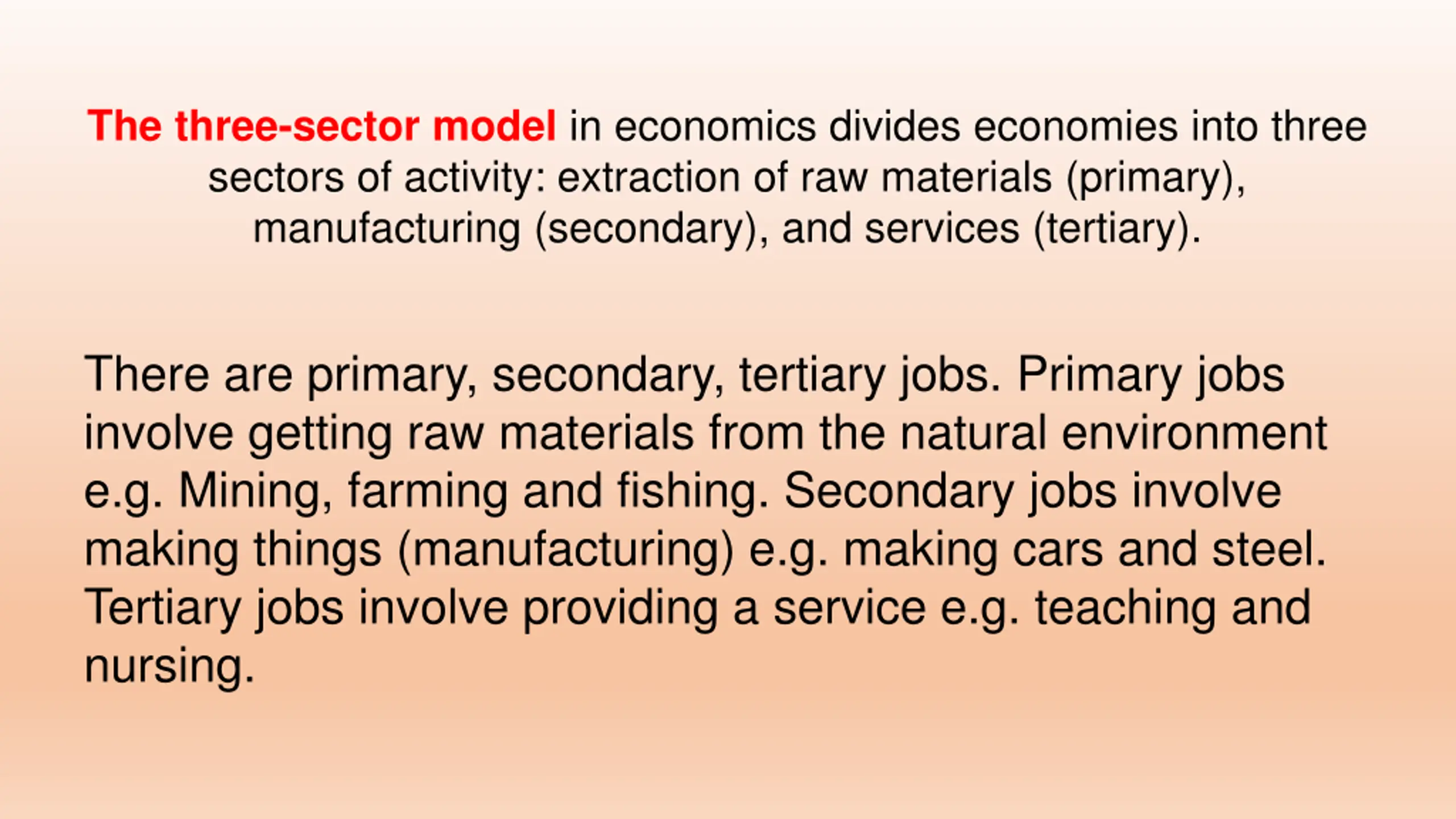 The three-sector model in economics divides economies into three sectors of activity: extraction of raw materials (primary), manufacturing (secondary), and services (tertiary). There are primary, secondary, tertiary jobs. Primary jobs involve getting raw materials from the natural environment e.g. Mining, farming and fishing. Secondary jobs involve making things (manufacturing) e.g. making cars and steel. Tertiary jobs involve providing a service e.g. teaching and nursing.