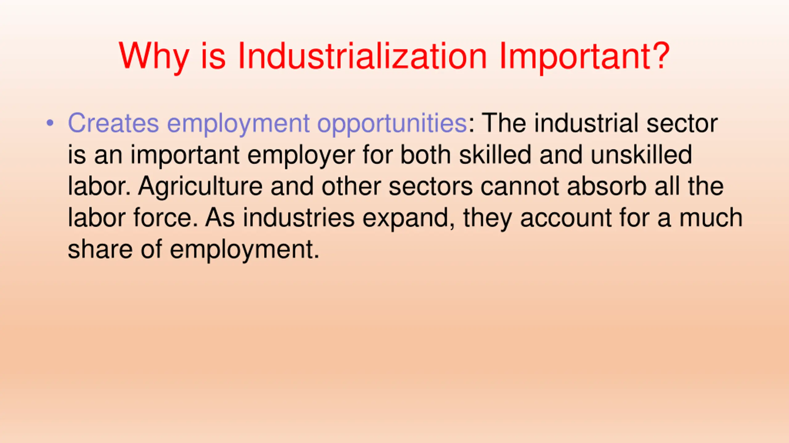 Why is Industrialization Important? Creates employment opportunities: The industrial sector is an important employer for both skilled and unskilled labor. Agriculture and other sectors cannot absorb all the labor force. As industries expand, they account for a much share of employment.
