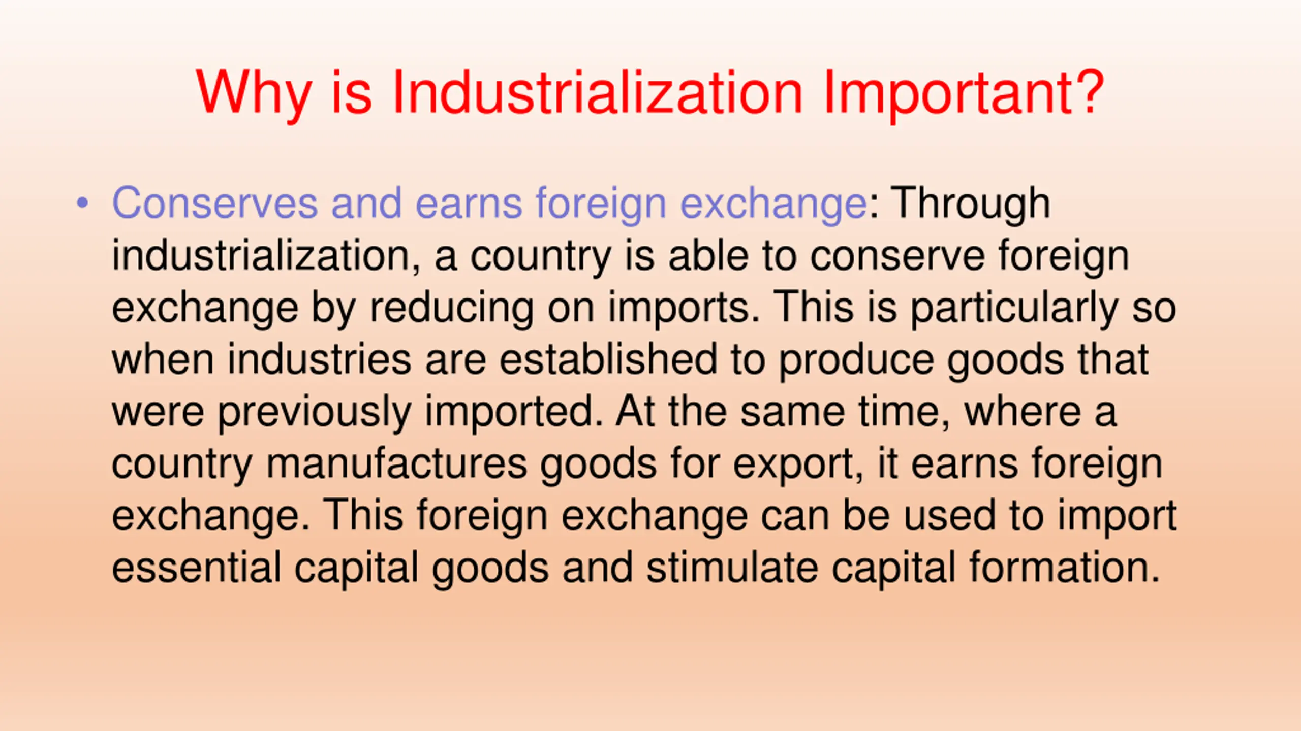 Why is Industrialization Important? Conserves and earns foreign exchange: Through industrialization, a country is able to conserve foreign exchange by reducing on imports. This is particularly so when industries are established to produce goods that were previously imported. At the same time, where a country manufactures goods for export, it earns foreign exchange. This foreign exchange can be used to import essential capital goods and stimulate capital formation.