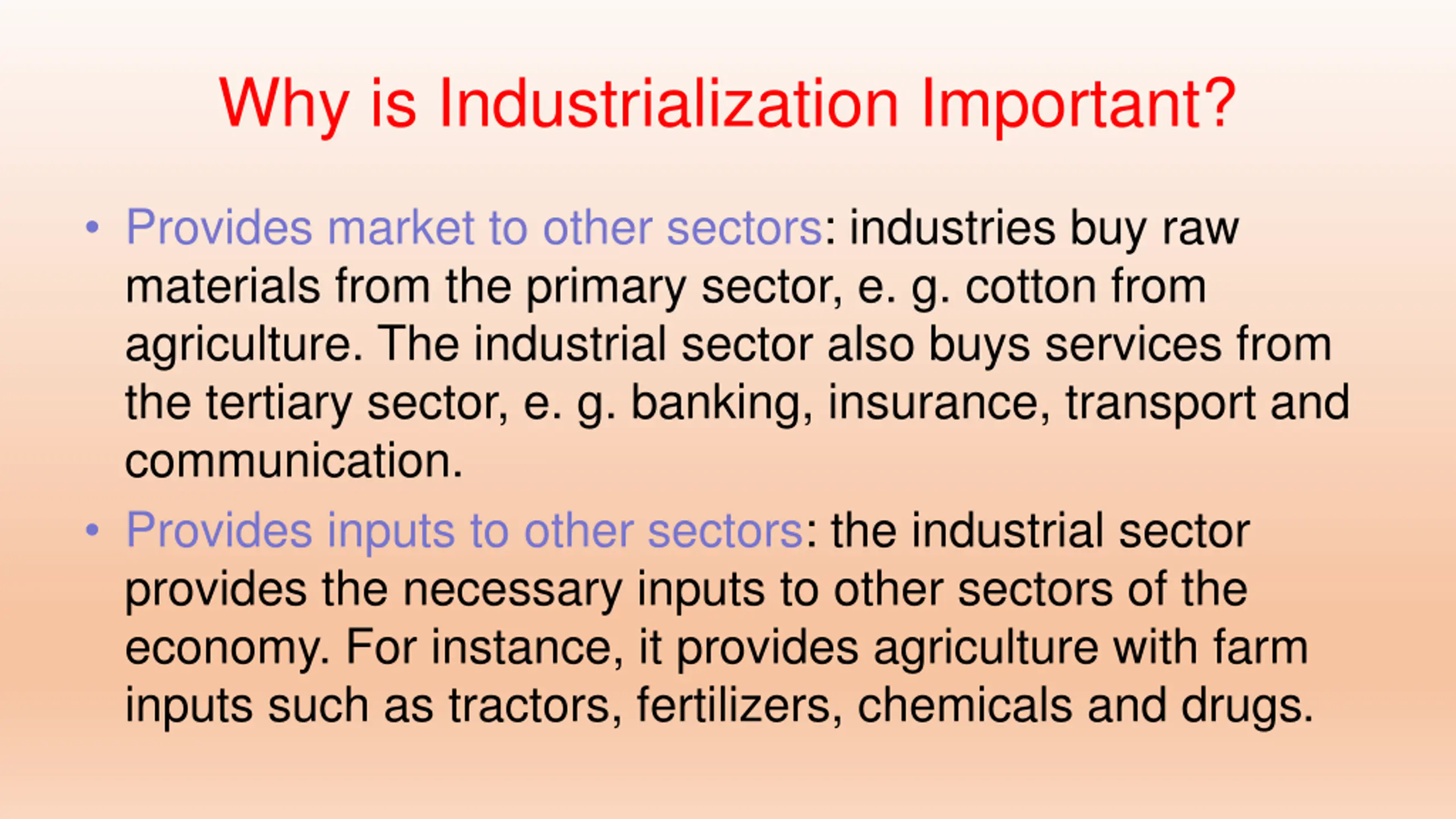 Why is Industrialization Important? Provides market to other sectors: industries buy raw materials from the primary sector, e. g. cotton from agriculture. The industrial sector also buys services from the tertiary sector, e. g. banking, insurance, transport and communication. Provides inputs to other sectors: the industrial sector provides the necessary inputs to other sectors of the economy. For instance, it provides agriculture with farm inputs such as tractors, fertilizers, chemicals and drugs.