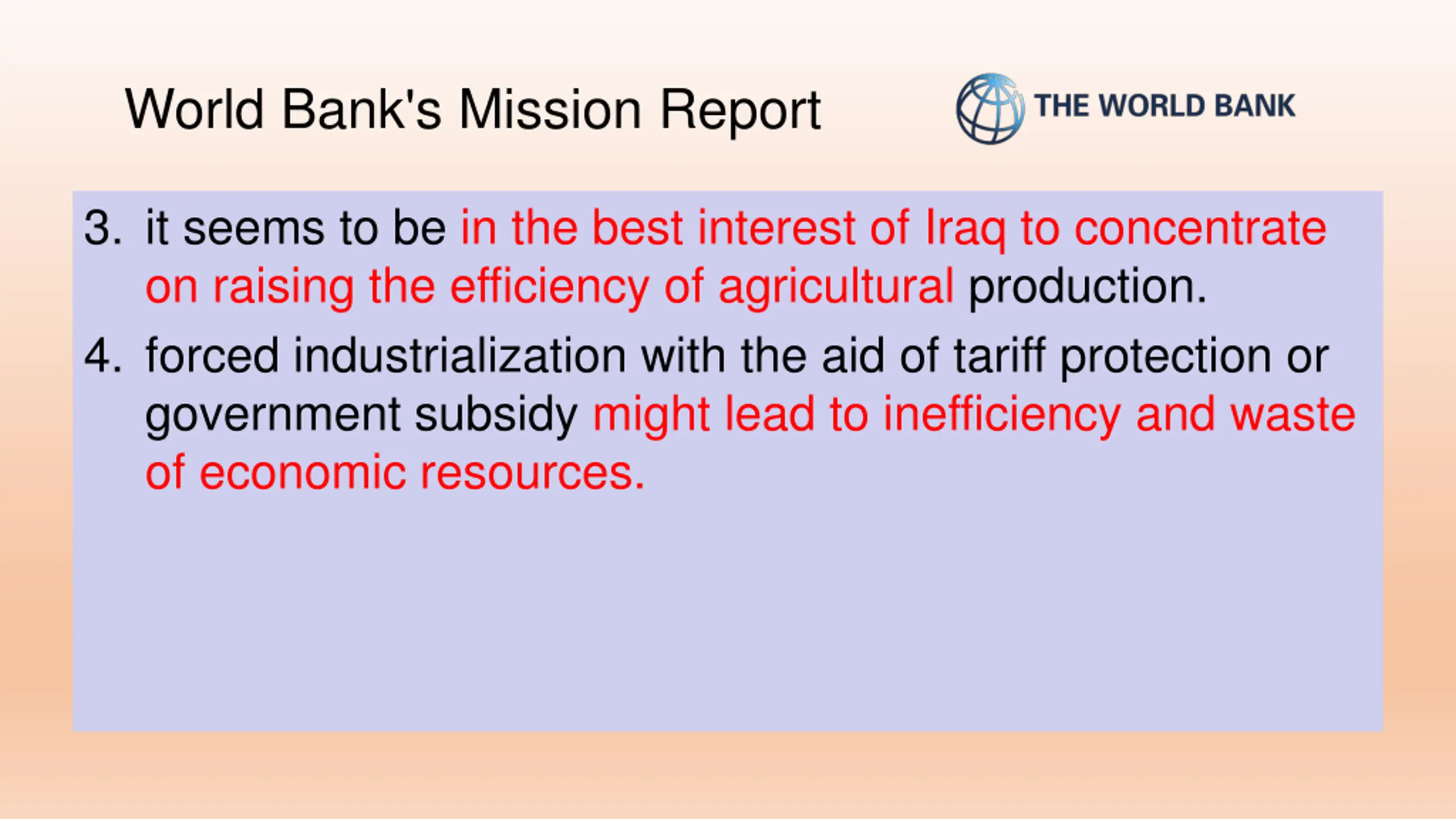 World Bank's Mission Report 3. it seems to be in the best interest of Iraq to concentrate on raising the efficiency of agricultural production. 4. forced industrialization with the aid of tariff protection or government subsidy might lead to inefficiency and waste of economic resources.