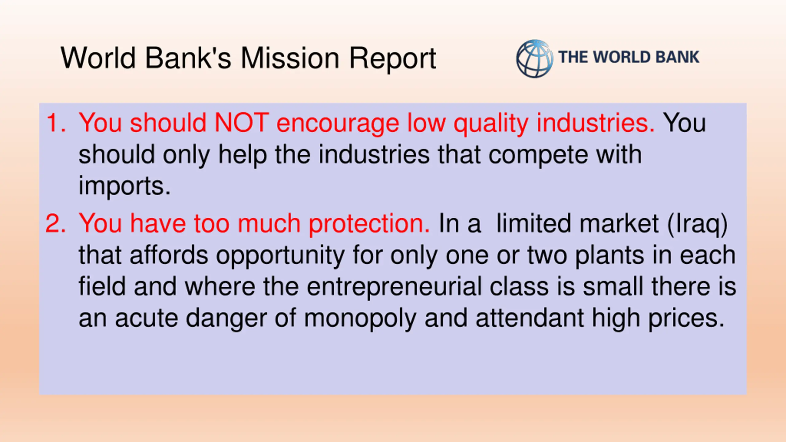 World Bank's Mission Report 1. You should NOT encourage low quality industries. You should only help the industries that compete with imports. 2. You have too much protection. In a limited market (Iraq) that affords opportunity for only one or two plants in each field and where the entrepreneurial class is small there is an acute danger of monopoly and attendant high prices.