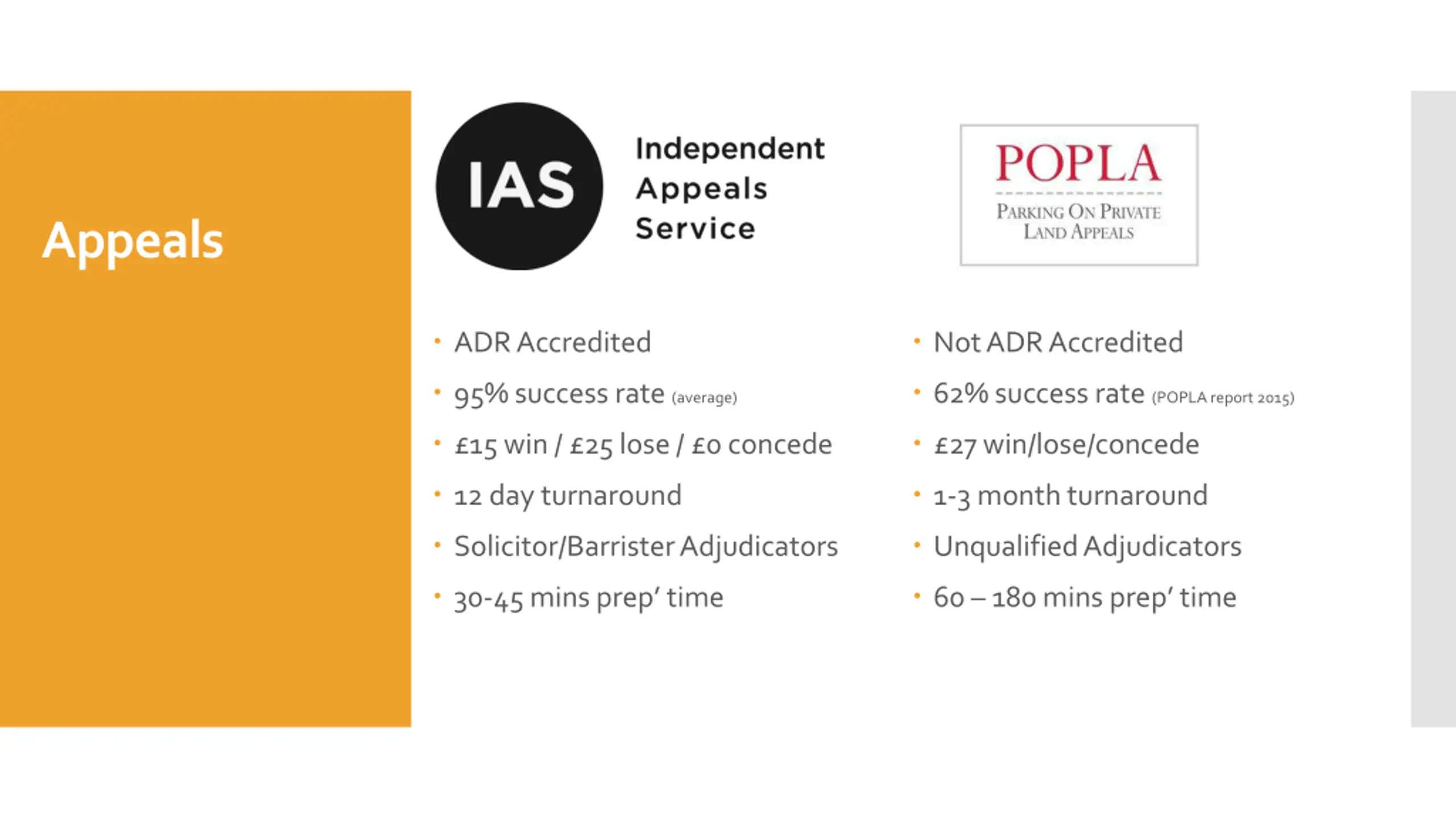 Appeals ADR Accredited Not ADR Accredited 95% success rate (average) 62% success rate (POPLA report 2015) 15 win / 25 lose / 0 concede 27 win/lose/concede 12 day turnaround 1-3 month turnaround Solicitor/Barrister Adjudicators Unqualified Adjudicators 30-45 mins prep time 60 180 mins prep time
