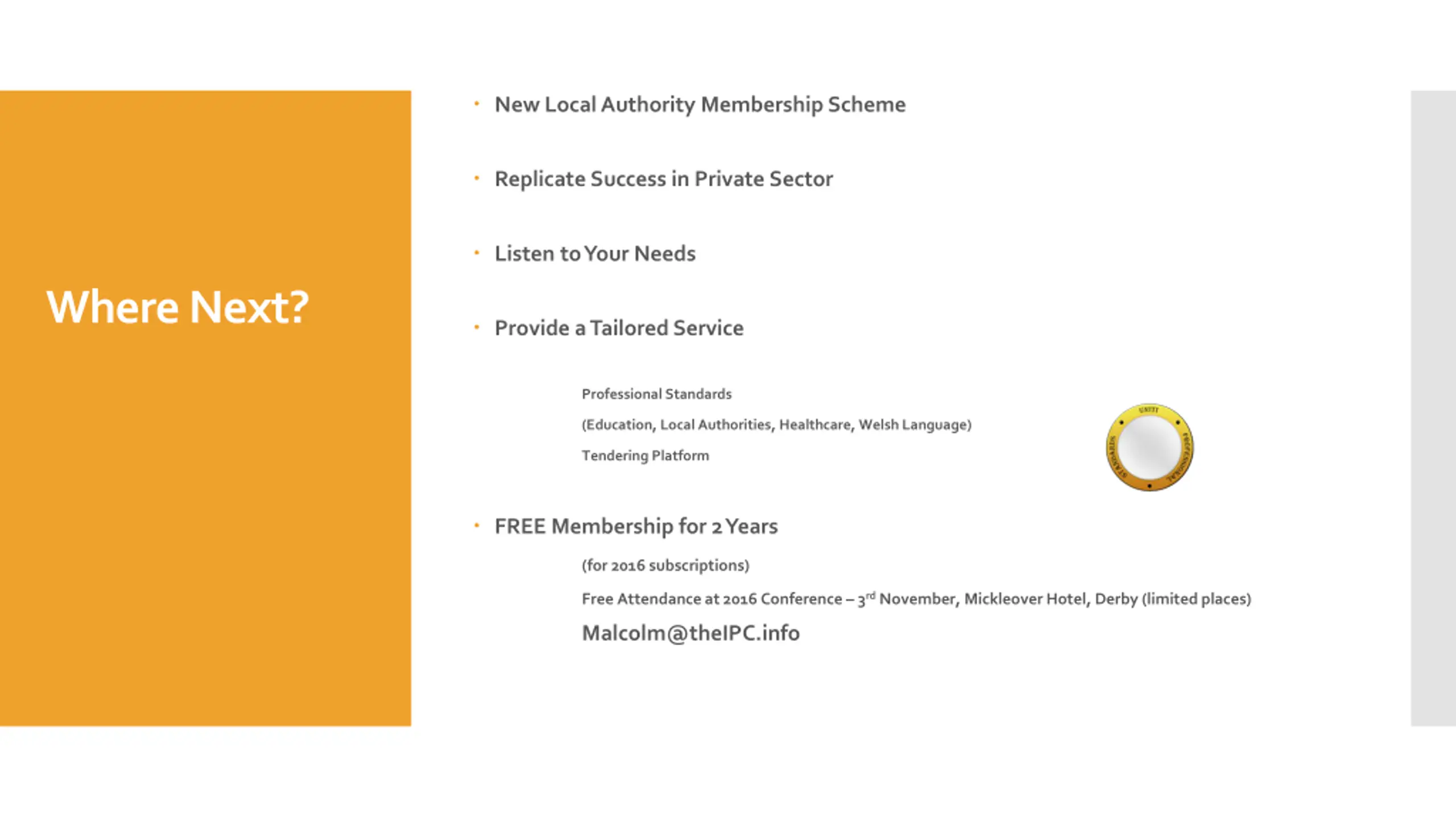 New Local Authority Membership Scheme Replicate Success in Private Sector Listen to Your Needs Where Next? Provide a Tailored Service Professional Standards (Education, Local Authorities, Healthcare, Welsh Language) Tendering Platform FREE Membership for 2 Years (for 2016 subscriptions) Free Attendance at 2016 Conference 3rd November, Mickleover Hotel, Derby (limited places) Malcolm@theIPC.info