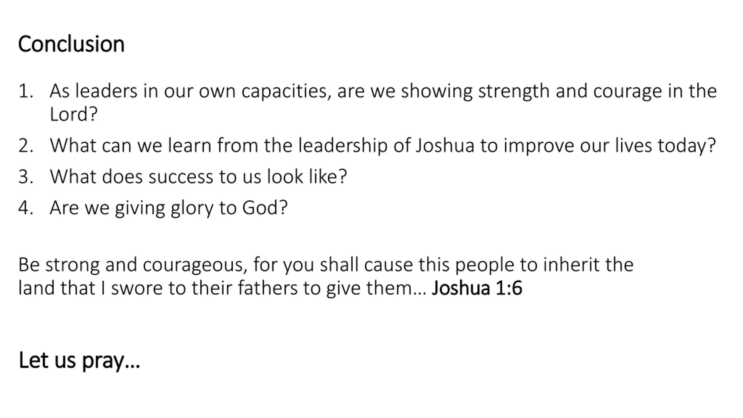 Conclusion Conclusion 1. As leaders in our own capacities, are we showing strength and courage in the Lord? 2. What can we learn from the leadership of Joshua to improve our lives today? 3. What does success to us look like? 4. Are we giving glory to God? Be strong and courageous, for you shall cause this people to inherit the land that I swore to their fathers to give them Joshua 1:6 Joshua 1:6 Let us pray Let us pray