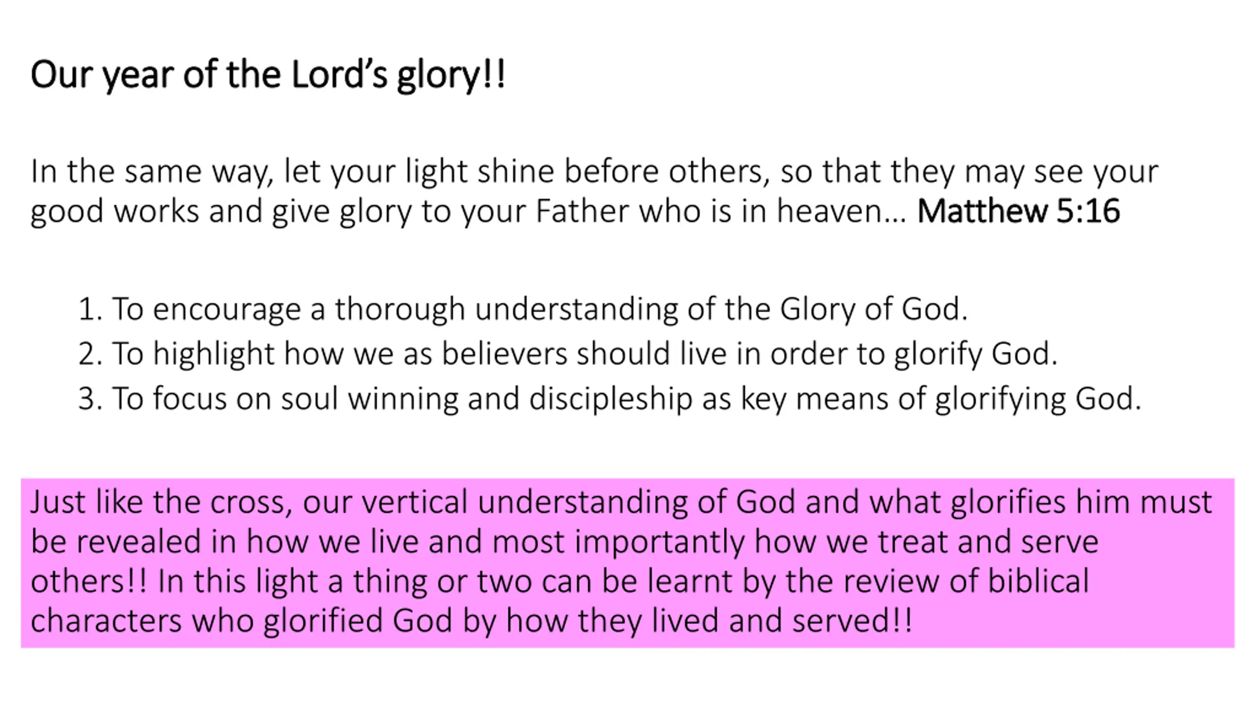 Our year of the Lords glory!! Our year of the Lord s glory!! In the same way, let your light shine before others, so that they may see your good works and give glory to your Father who is in heaven Matthew 5:16 Matthew 5:16 1. To encourage a thorough understanding of the Glory of God. 2. To highlight how we as believers should live in order to glorify God. 3. To focus on soul winning and discipleship as key means of glorifying God. Just like the cross, our vertical understanding of God and what glorifies him must be revealed in how we live and most importantly how we treat and serve others!! In this light a thing or two can be learnt by the review of biblical characters who glorified God by how they lived and served!!