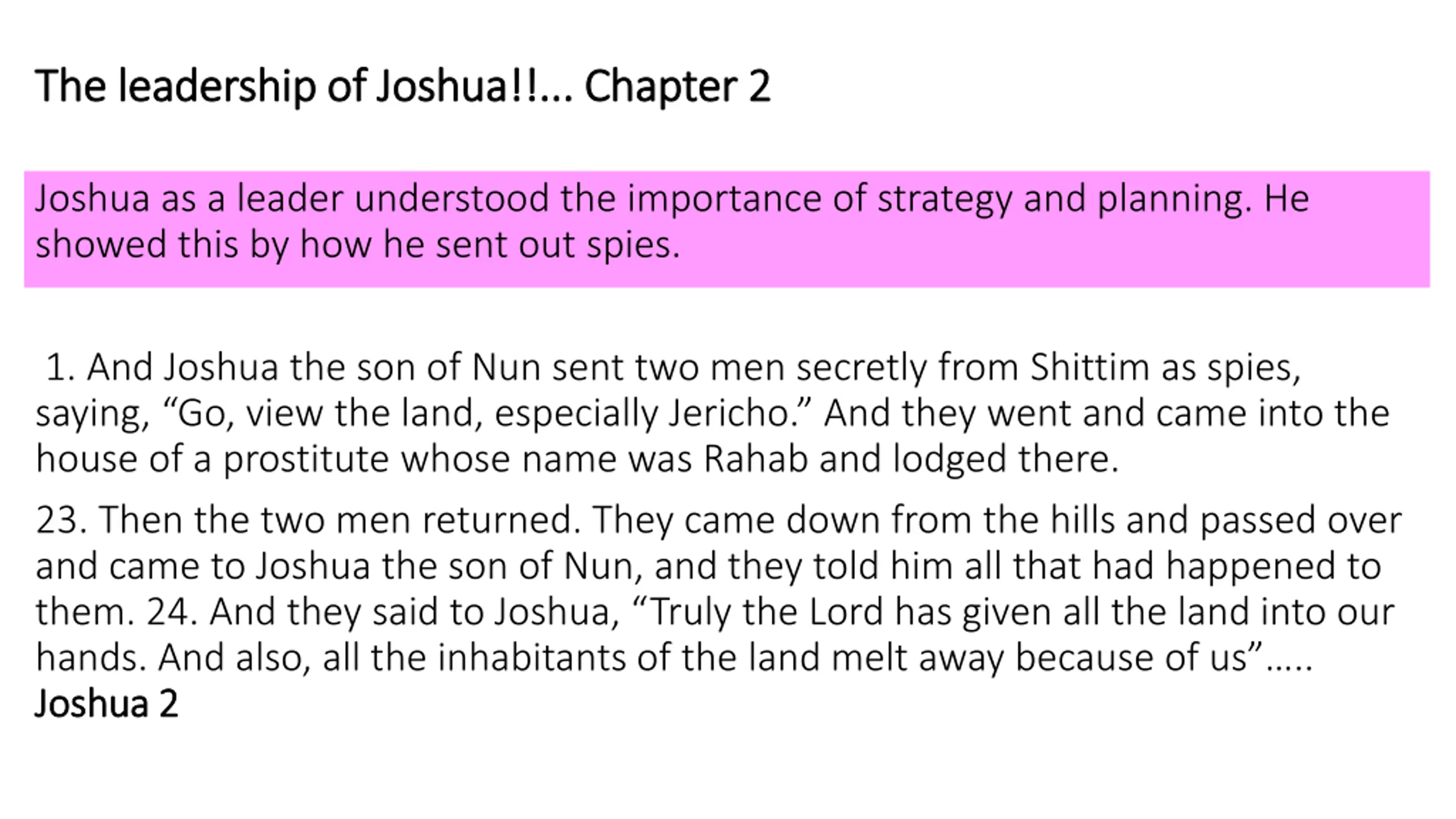 The leadership of Joshua!!... Chapter 2 The leadership of Joshua!!... Chapter 2 Joshua as a leader understood the importance of strategy and planning. He showed this by how he sent out spies. 1. And Joshua the son of Nun sent two men secretly from Shittim as spies, saying, Go, view the land, especially Jericho. And they went and came into the house of a prostitute whose name was Rahab and lodged there. 23. Then the two men returned. They came down from the hills and passed over and came to Joshua the son of Nun, and they told him all that had happened to them. 24. And they said to Joshua, Truly the Lord has given all the land into our hands. And also, all the inhabitants of the land melt away because of us .. Joshua 2 Joshua 2