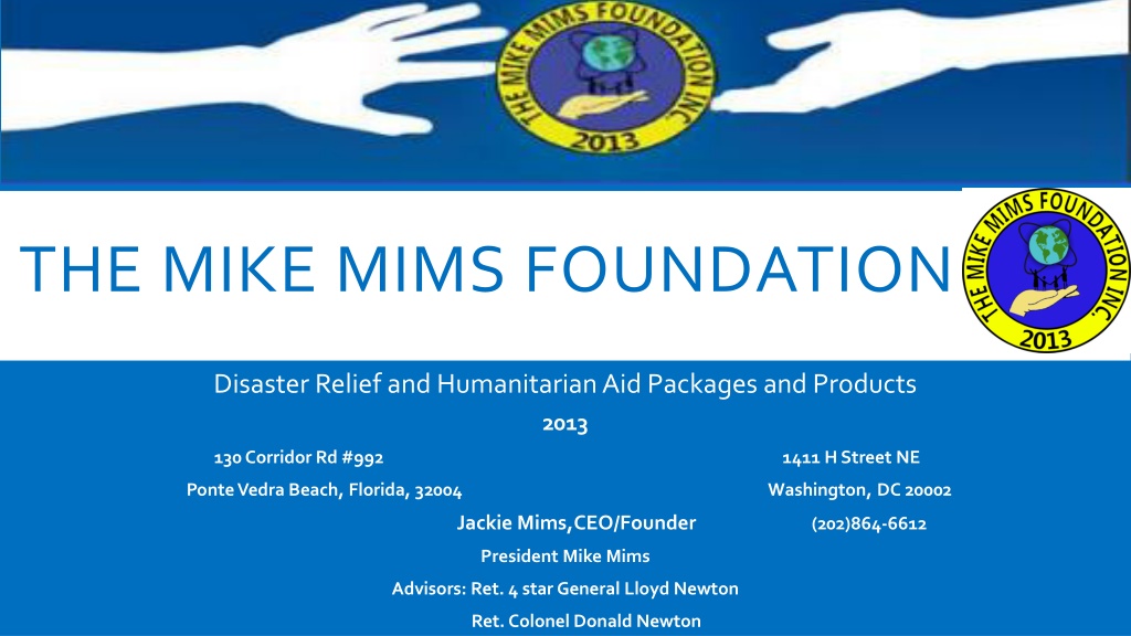 THE MIKE MIMS FOUNDATION Disaster Relief and Humanitarian Aid Packages and Products 2013 130 Corridor Rd #992 1411 H Street NE Ponte Vedra Beach, Florida, 32004 Washington, DC 20002 Jackie Mims,CEO/Founder (202)864-6612 President Mike Mims Advisors: Ret. 4 star General Lloyd Newton Ret. Colonel Donald Newton