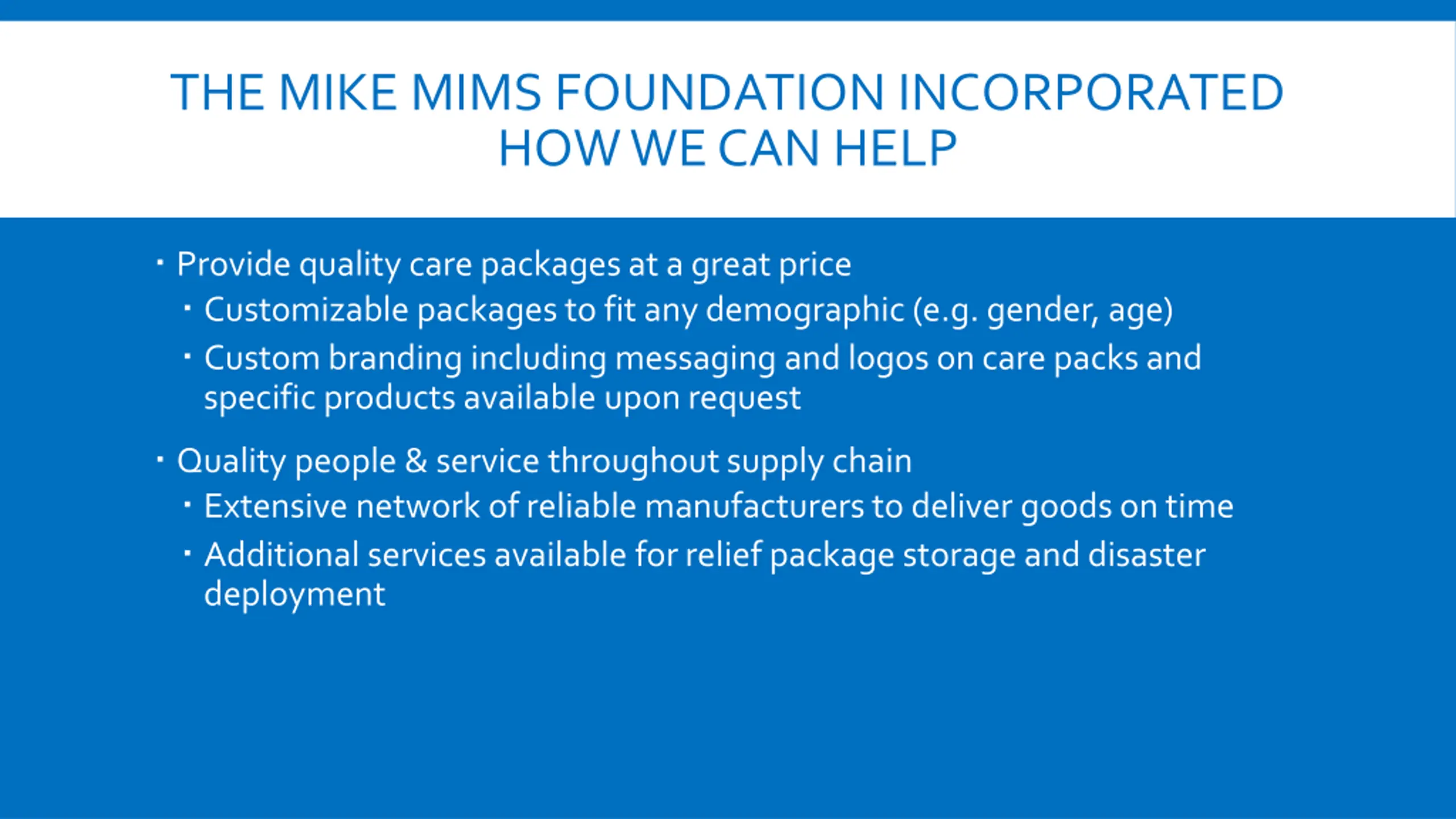 THE MIKE MIMS FOUNDATION INCORPORATED HOW WE CAN HELP Provide quality care packages at a great price Customizable packages to fit any demographic (e.g. gender, age) Custom branding including messaging and logos on care packs and specific products available upon request Quality people & service throughout supply chain Extensive network of reliable manufacturers to deliver goods on time Additional services available for relief package storage and disaster deployment